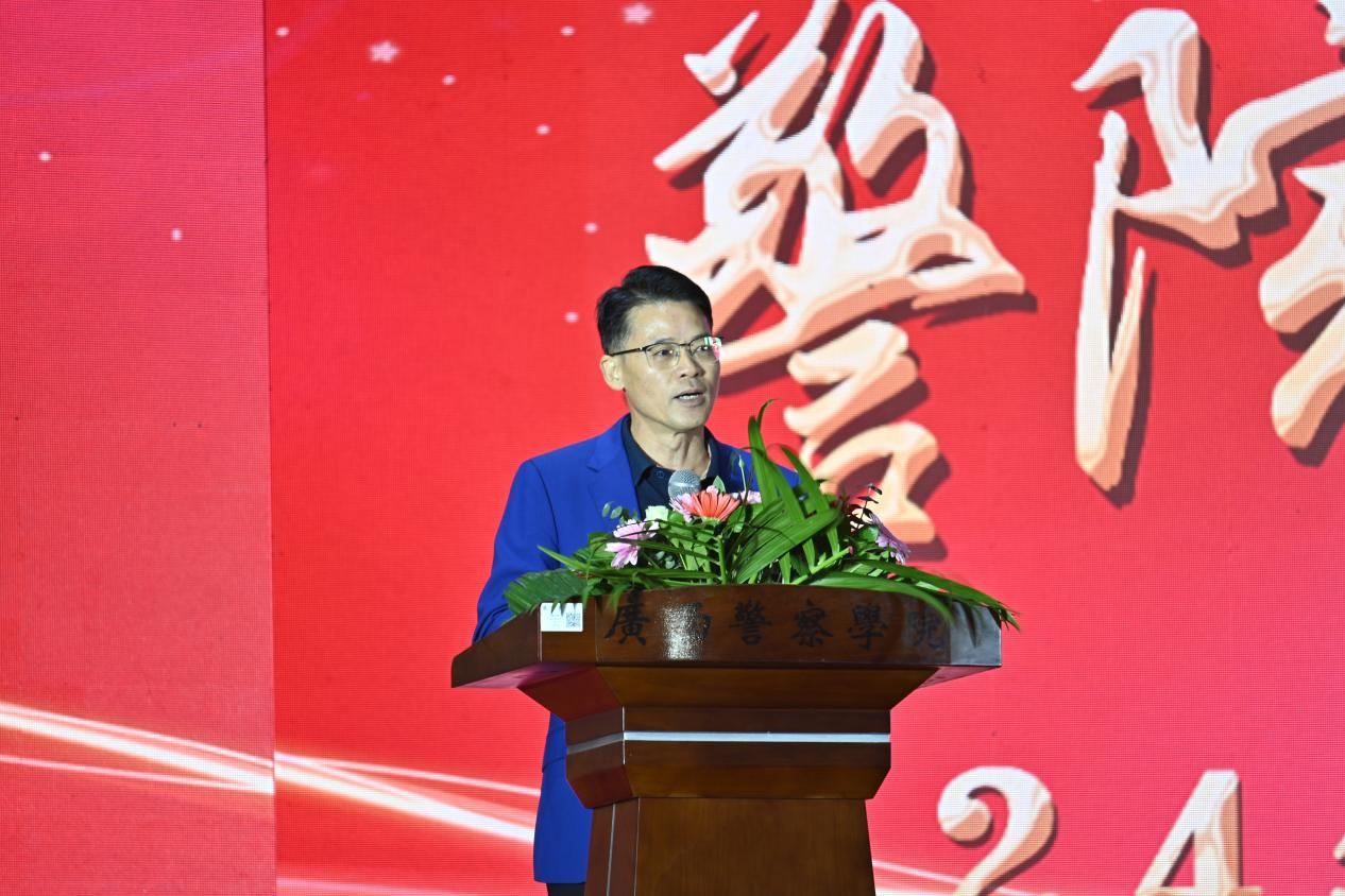 唐连荣同志作晚会致辞,他代表法学院全体师生欢迎2024级新生的到来。他表示,法学院秉持“崇法 明德 守正 笃行”的院训,坚持法安天下、德润人心、助人自助、有爱同行的理念和精神,形成德法兼修,纪律严明的人才培养特色,受到用人单位的高度认同。希望同学们珍惜青春年华,培养警院学子的特色和优势,多元发展,不断提高专业素养及综合能力,不负时代赋予的青春使命。