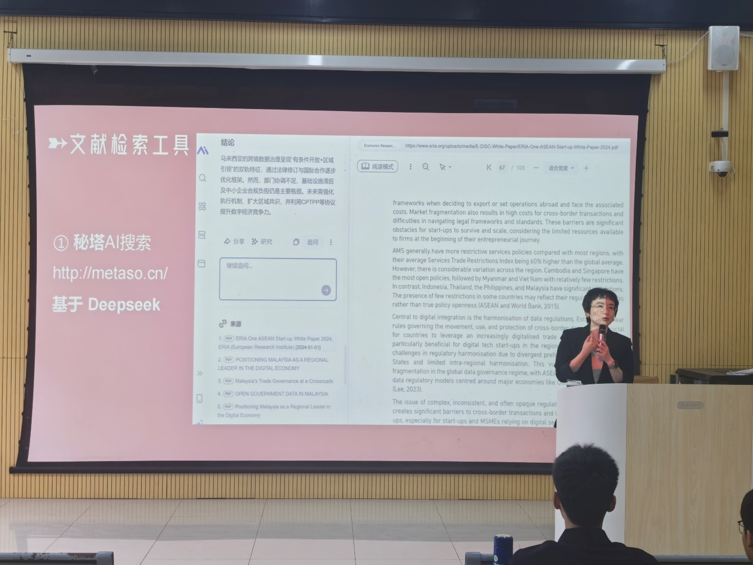 人工智能工具的技术赋能价值成为邓珊教授本次讲座的亮点之一。她为同学们分享了如何借助人工智能辅助提高专业外语学习的效率,如何利用生成式人工智能快速提取国际经贸规则的核心条款、梳理规则演进脉络以捕捉法律逻辑的本质。邓珊教授强调,人工智能热潮下国际经贸规则人才需实现“专业能力与技术创新”的协同发展,既要筑牢专业根基,也要善用人工智能工具。