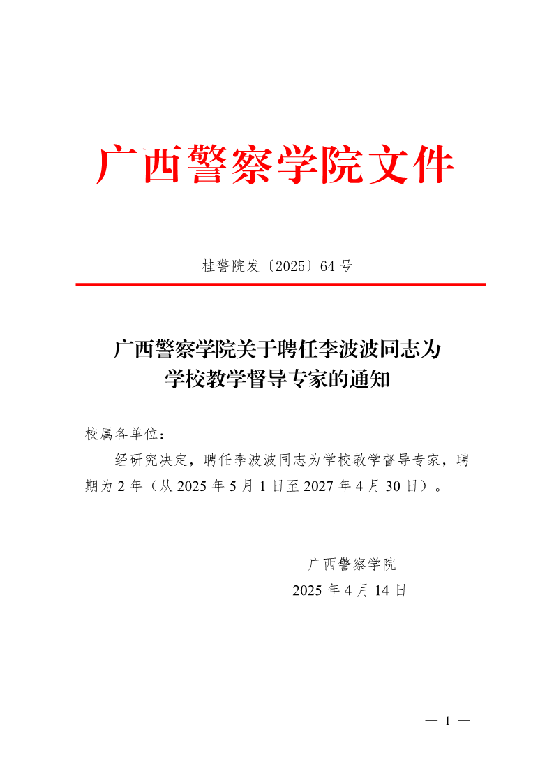 beat365唯一官方网站关于聘任李波波同志为学校教学督导专家的通知 来源:发展规划与质量评估处 发布时间:2025-04-22 16:19:07 浏览次数: 次 【字体:小 大】 分享到: 【打印正文】
