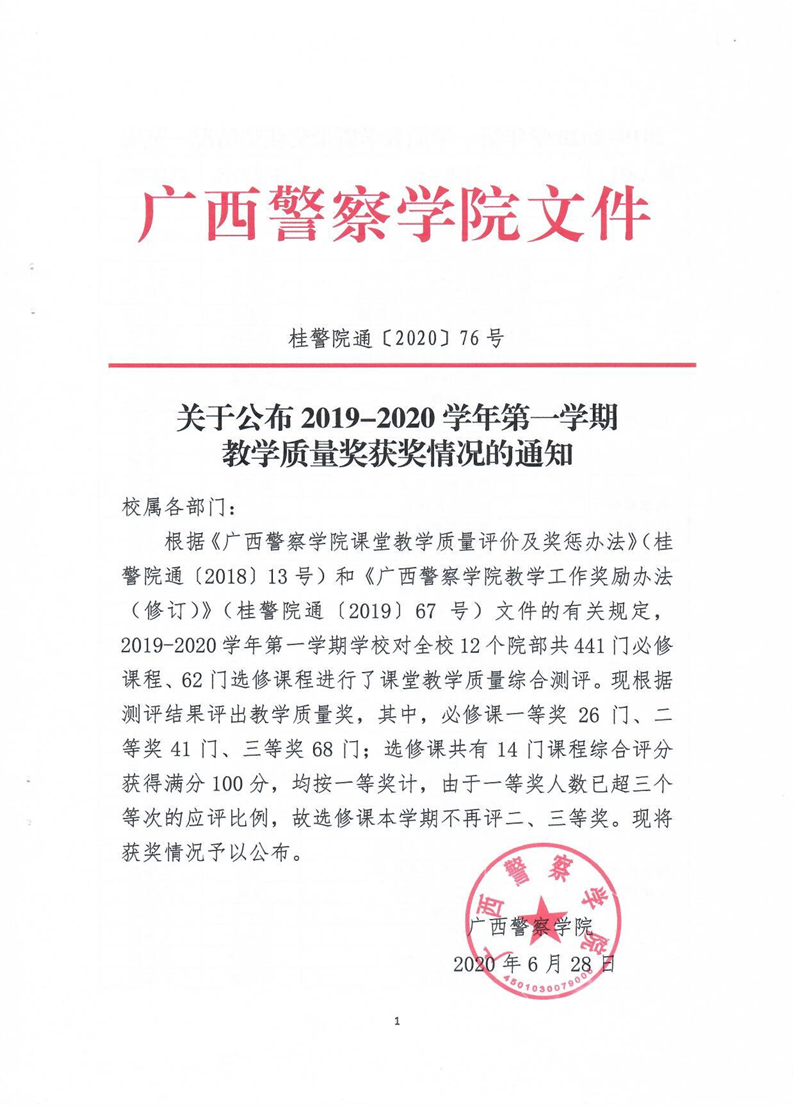 关于公布2019-2020学年第一学期教学质量奖获奖情况的通知