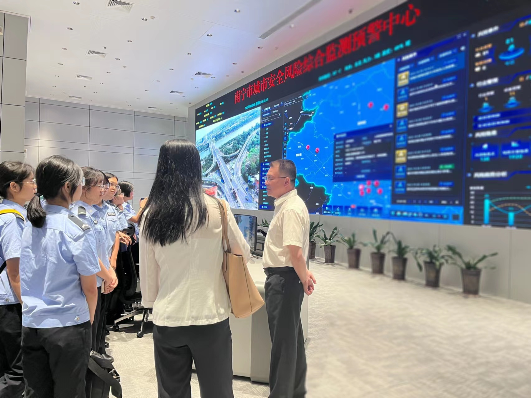 随后大家来到城市安全风险综合监测预警大厅,南宁市城市应急联动中心副主任、党组成员班卫东对南宁市城市应急联动中心发展历程和现状的详细介绍。他通过应急联动系统、城市安全风险监测预警平台,为学生们展示了南宁市在城市安全风险防控和应急管理方面的先进做法。他深入讲解了城市安全风险、应急联动机制、应急管理能力、事件联动处置方法等情况。