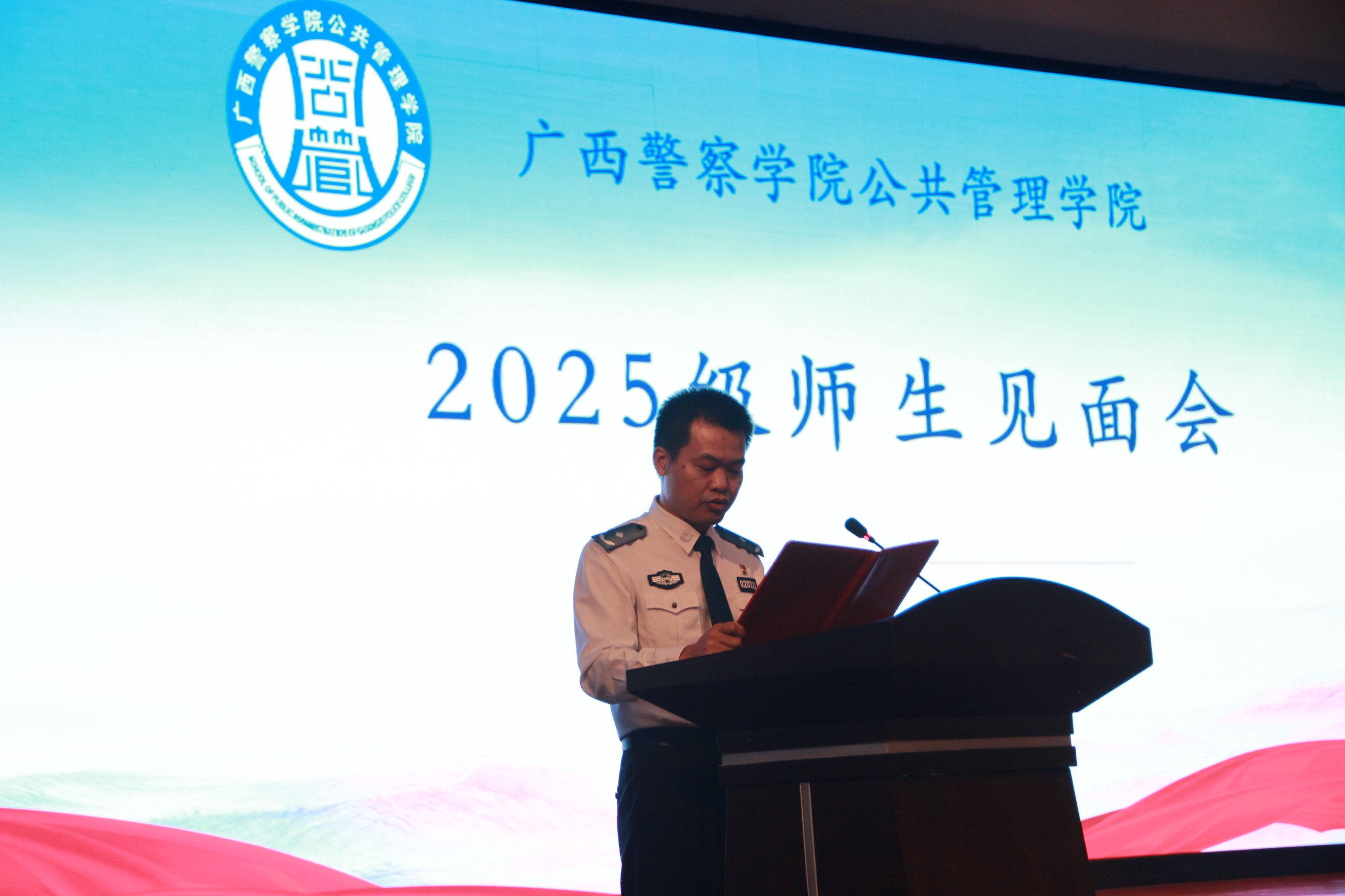 金秋桂馥启新程,藏蓝逐梦警院行。2025年9月21日下午,公共管理学院在仙葫校区学术报告中心隆重举行2025级师生见面会。学院领导班子、北京广慧金通公司驻校办主任、“三办”主任、8个教研室主任、5个研究中心主任、全体辅导员以及2025级全体新生共同参加了本次大会。会议由学院党总支副书记李海波主持。