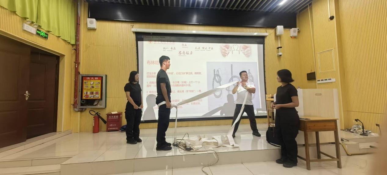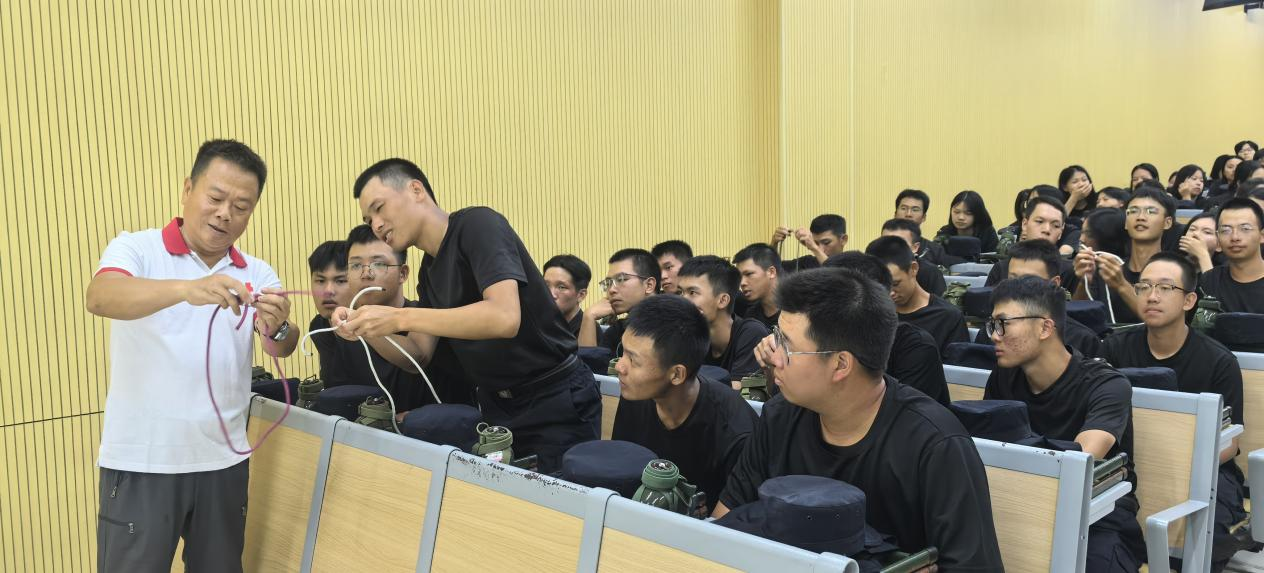 在实操环节,同学们分组练习绳索固定、打结、攀爬与下降等关键技术,重点体验了渔人结、布林结等实用绳结在承重与逃生场景中的应用。过程中,学生积极提问、认真操作,通过亲手实践加深了对救援技术要领的掌握,也体会到救援人员在实战中的专业要求与责任担当。