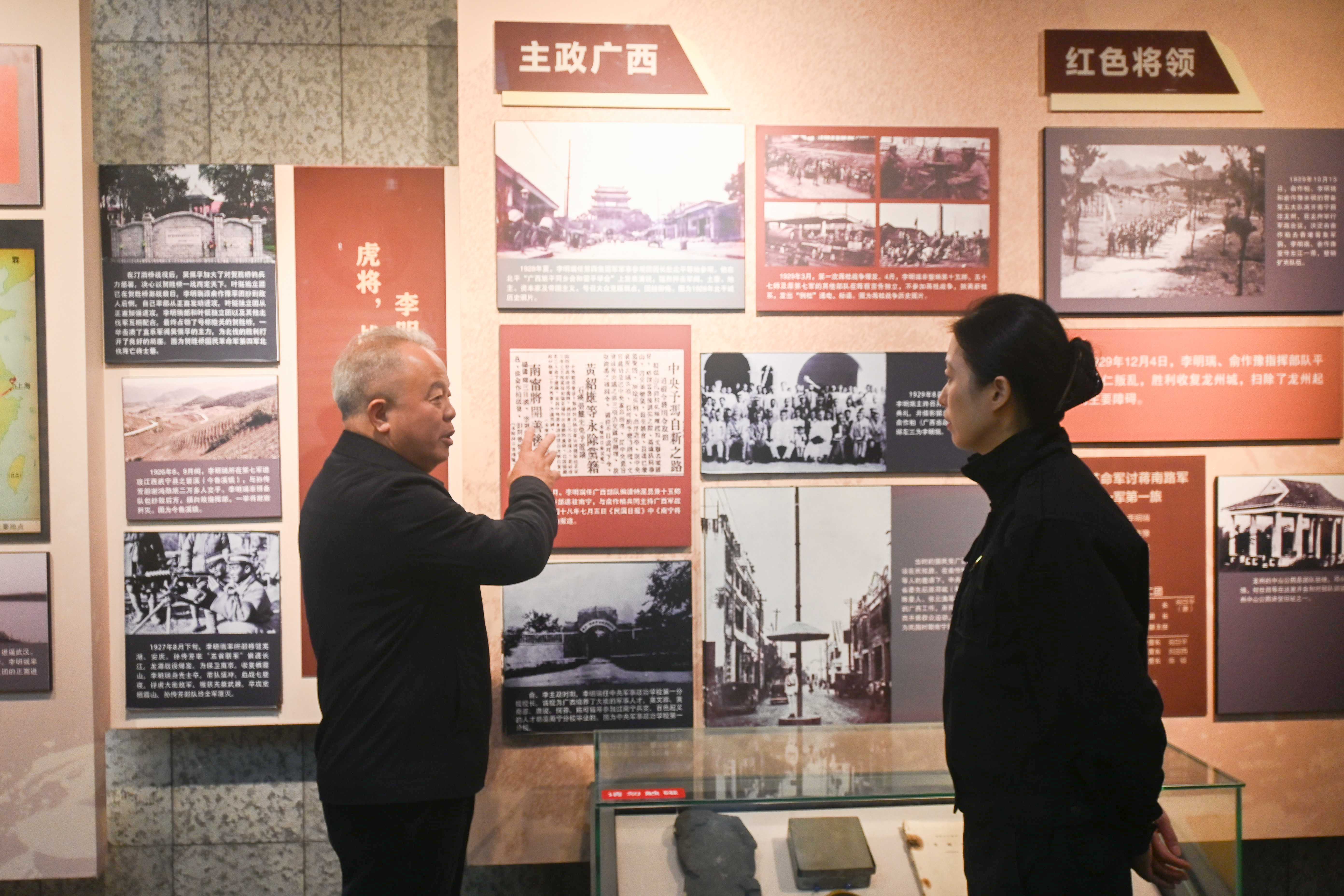 在李明瑞、韦拔群等革命烈士纪念馆,党总支书记樊宗高亲自担任“讲解员”,带领师生党员们有序参观、深情讲解。他结合自身对革命历史的深刻理解,循着展厅脉络,从烈士们投身革命的初心缘起,到烽火岁月中挺身而出的英勇壮举,再到为理想信念慷慨赴死的崇高抉择,用详实生动的语言还原了一个个感人至深的历史场景。讲解中,樊宗高书记时而驻足于珍贵的历史文物前,细数其背后承载的革命故事;时而凝视着泛黄的老照片与文献资料,深情阐释先烈们在艰难险阻中坚守的忠诚担当。师生党员们围站身旁,静静聆听、认真感悟,在书记的引领下沉浸式回溯革命先烈英勇奋斗的光辉历程,深刻体会他们无私奉献的崇高信仰与炽热的家国情怀。
