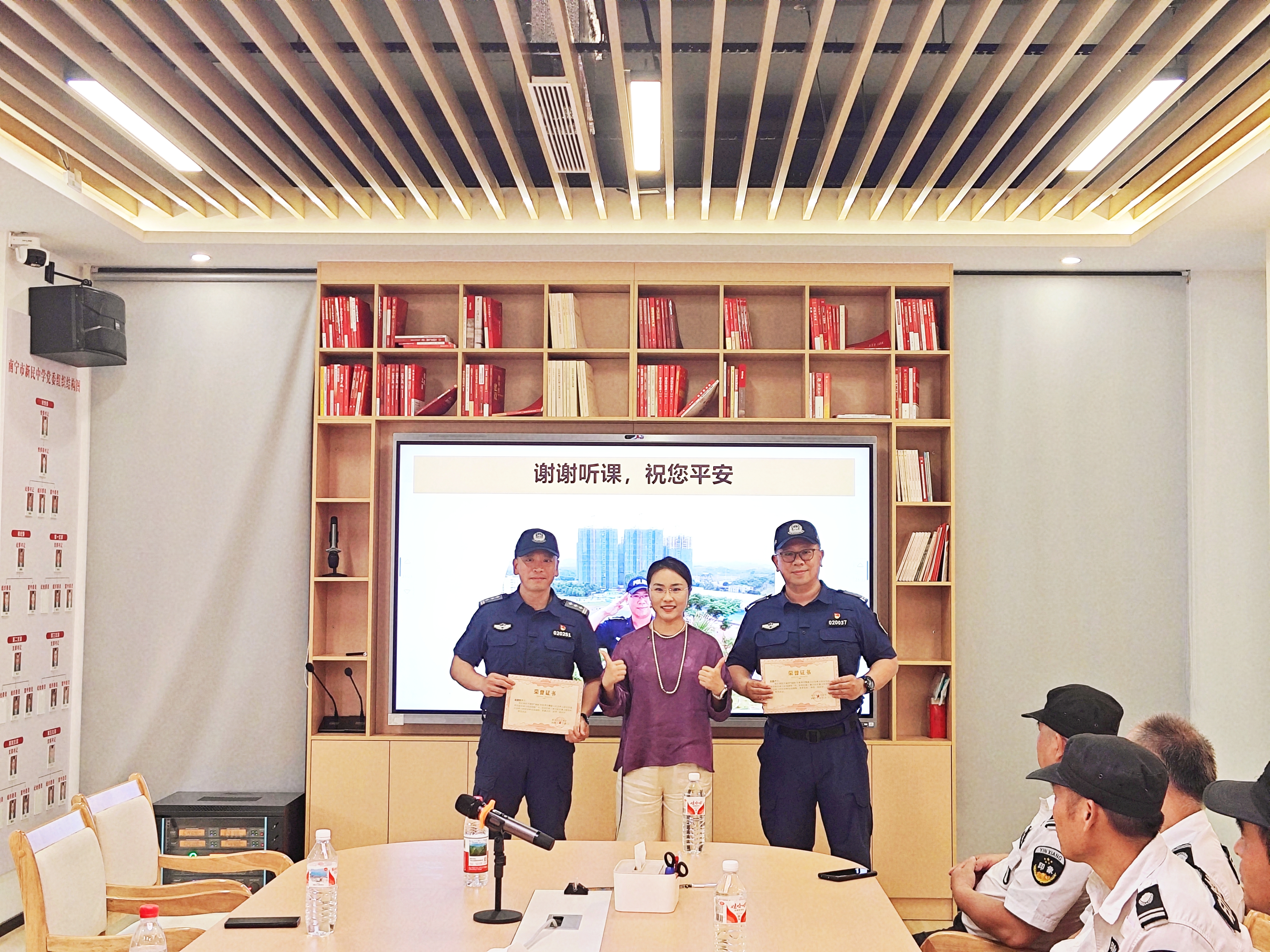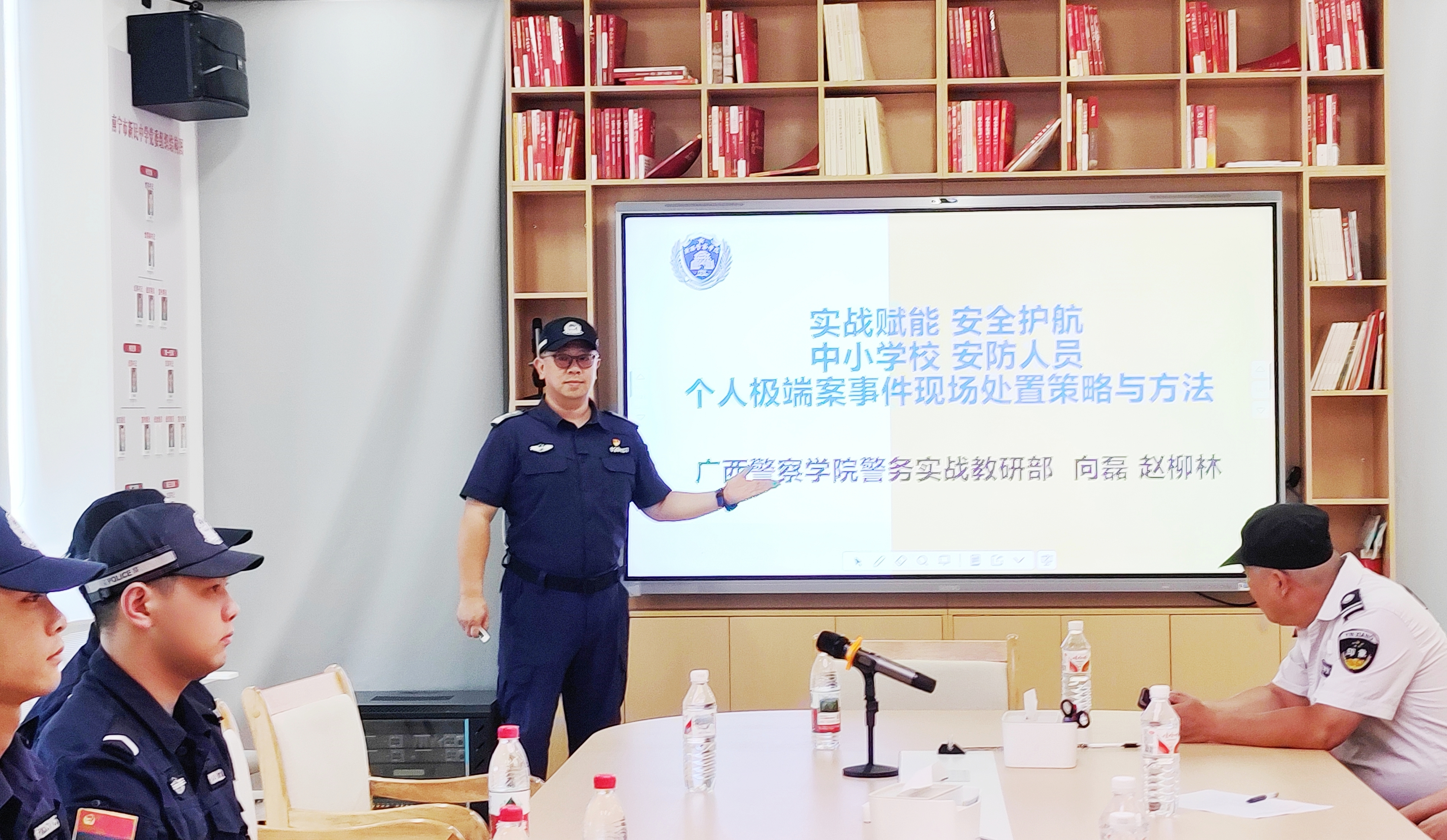 为深入贯彻落实《全区中小学幼儿园最小应急单元保安员战术技能培训与实战演练方案的通知》要求,进一步强化校园安全防范工作,切实保障师生人身安全,4月25日下午,警务实战教研部警察徒手防卫与控制教研室主任赵柳林、警械使用教研室主任向磊,带领学校战协3名学生走进南宁市新民中学,开展“学校安保人员预防应对个人极端案事件的现场处置策略和方法”专题讲座及实战演练。南宁市新民中学副校长关雪、政教处全体成员、体育教师、全体保安员参与此次培训活动。