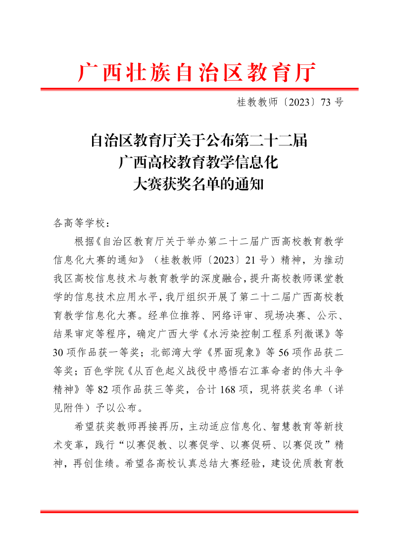 桂教教师〔2023〕73号自治区教育厅关于公布第二十二届广西高校教育教学信息化大赛获奖名单的通知 来源: 发布时间:2024-01-05 12:01:57 浏览次数: 次 【字体:小 大】 分享到: 【打印正文】