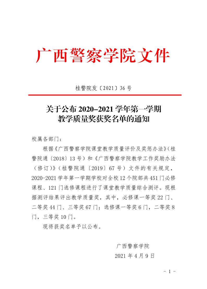 关于公布2020-2021学年第一学期教学质量奖获奖名单的通知