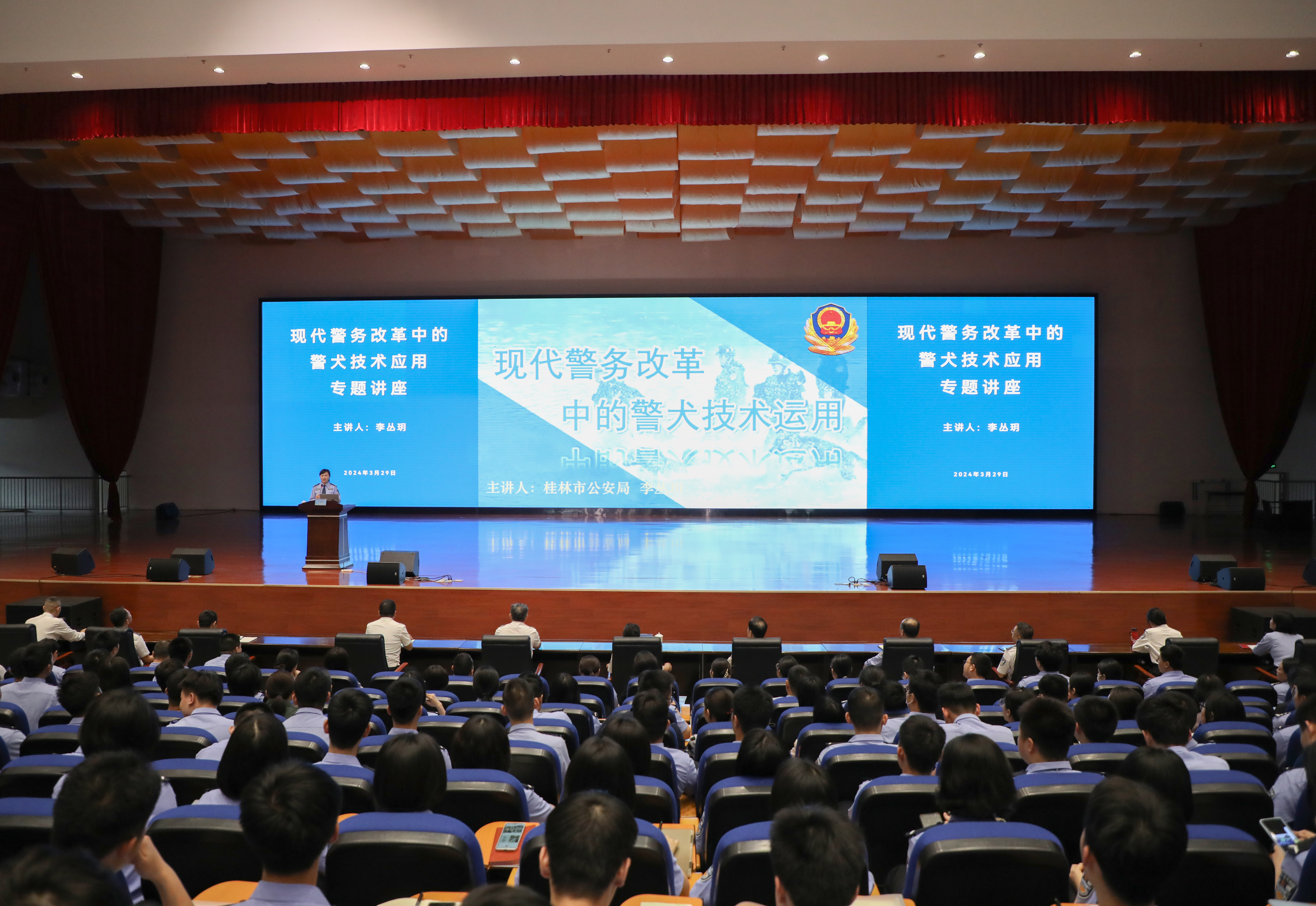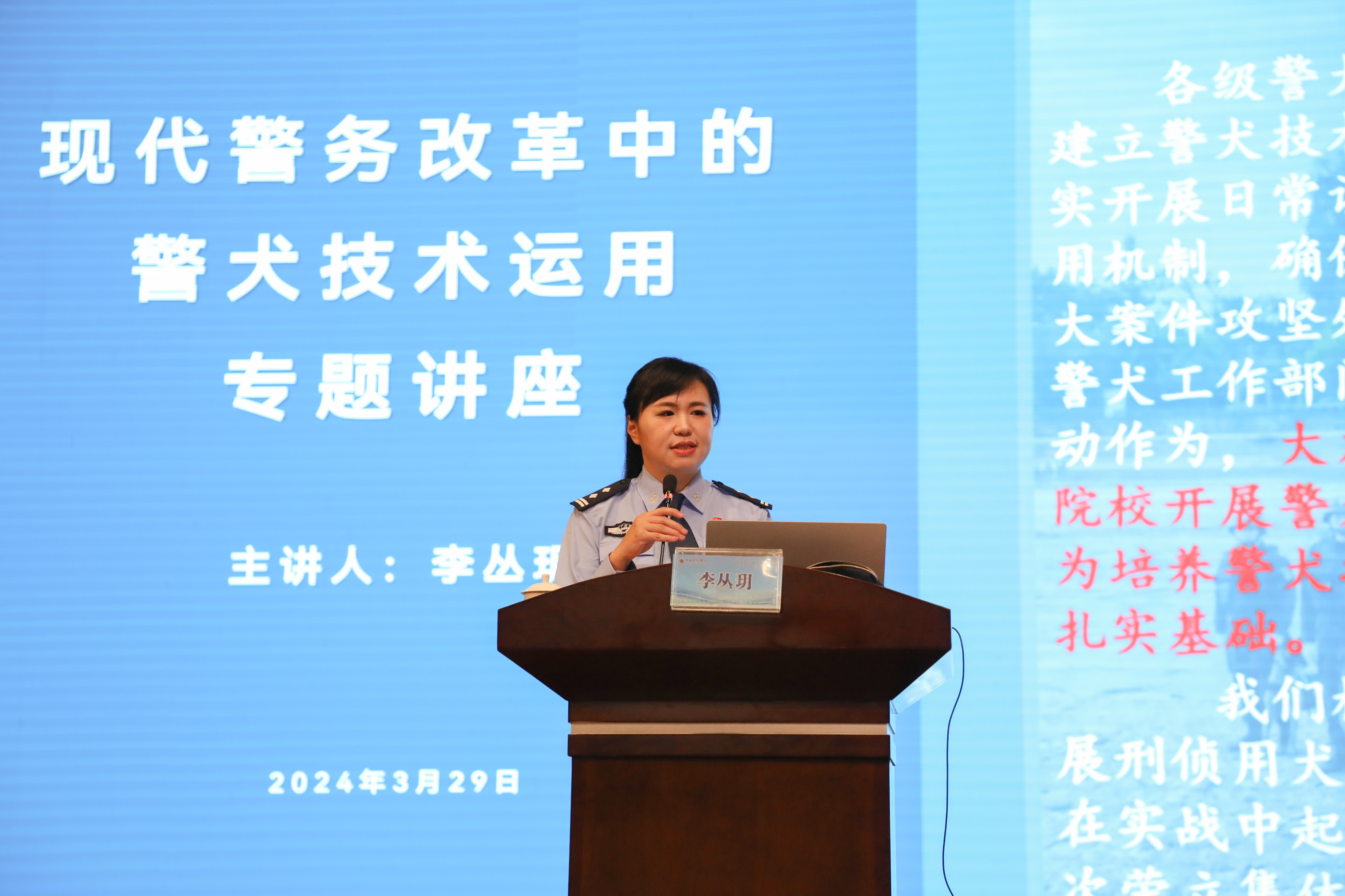 为活跃学术气氛,加强校局学术交流,让一线公安干警走进校园帮助师生进一步了解现代警犬技术的发展与应用,2024年3月29日下午,学校邀请桂林市公安局刑侦支队警犬大队李丛玥副大队长在仙葫校区学术报告中心举办了《现代警务改革中的警犬技术应用》专题讲座,讲座由科研处曾伟处长主持,张军校长出席,仙葫校区全体无课师生、五合校区教师代表共计800余人参加了讲座。