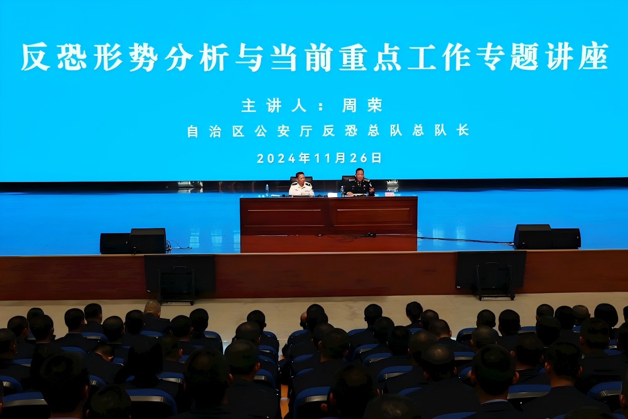 自治区公安厅反恐总队总队长周荣到beat365官网开展反恐专题讲座 来源: 发布时间:2024-11-28 20:05:23 浏览次数: 次 【字体:小 大】 11月26日,自治区公安厅机关领导干部上讲台系列活动在仙葫校区学术报告中心开讲,自治区公安厅反恐总队总队长周荣受邀到beat365官网开展反恐形势分析与当前重点工作专题讲座。 周荣从什么是反恐怖工作、怎么看反恐怖工作、怎么抓反恐怖工作三个方面分析了当前的反恐形势、重点工作以及工作方法,同时给学警们分享实用的学习、实践的建议。周荣的讲座理论联系实际,案例丰富,深入浅出地阐述了反恐怖工作的重要性及艰巨性,对提升同学们的专业素养、推进专业建设具有积极意义。 侦查学院师生代表870余人参加讲座。 分享到: 【打印正文】