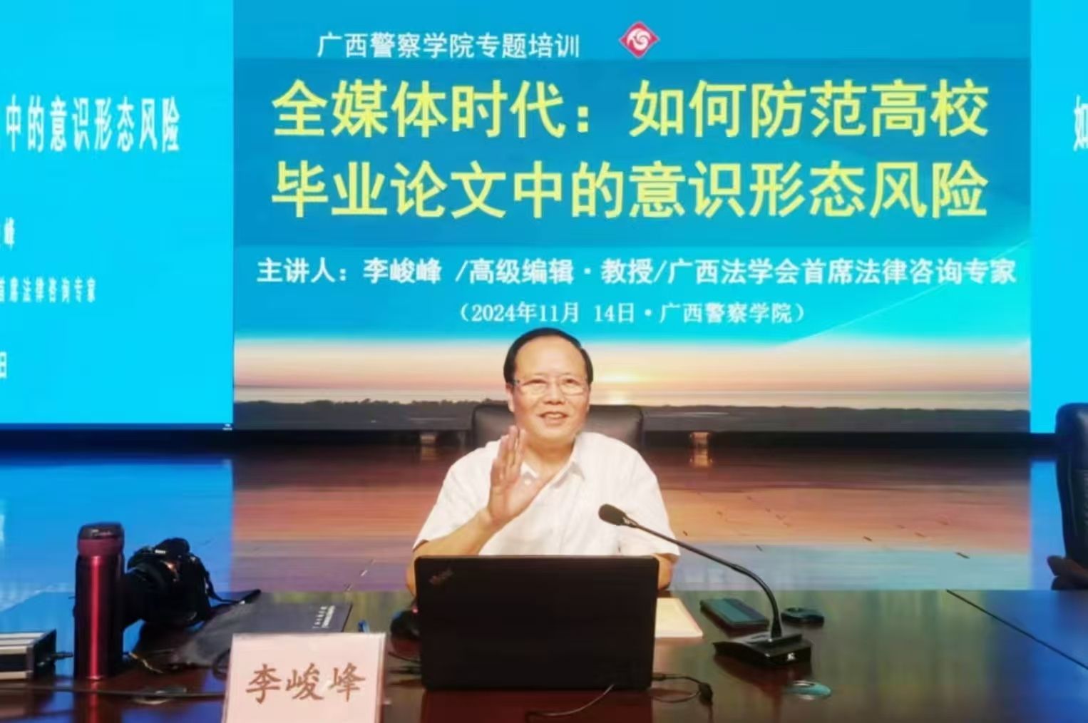 学校举办意识形态风险防范专题讲座 来源: 发布时间:2024-11-14 19:45:54 浏览次数: 次 【字体:小 大】 为进一步强化学生意识形态风险防范意识,提高学生毕业论文质量,学校邀请了广西法学会原副会长、广西法制日报社原社长总编辑李峻峰教授于2024年11月14日下午在学校仙葫校区学术报告中心举办《全媒体时代:如何防范高校毕业生论文中的意识形态风险》专题讲座。学校各教学院部、继续教育学院分管教学和科研副院长(副主任)、各教学院部教研室主任、承担学生毕业论文指导的专任教师以及仙葫校区五个二级学院部分学生共600多人聆听了讲座。 分享到: 【打印正文】