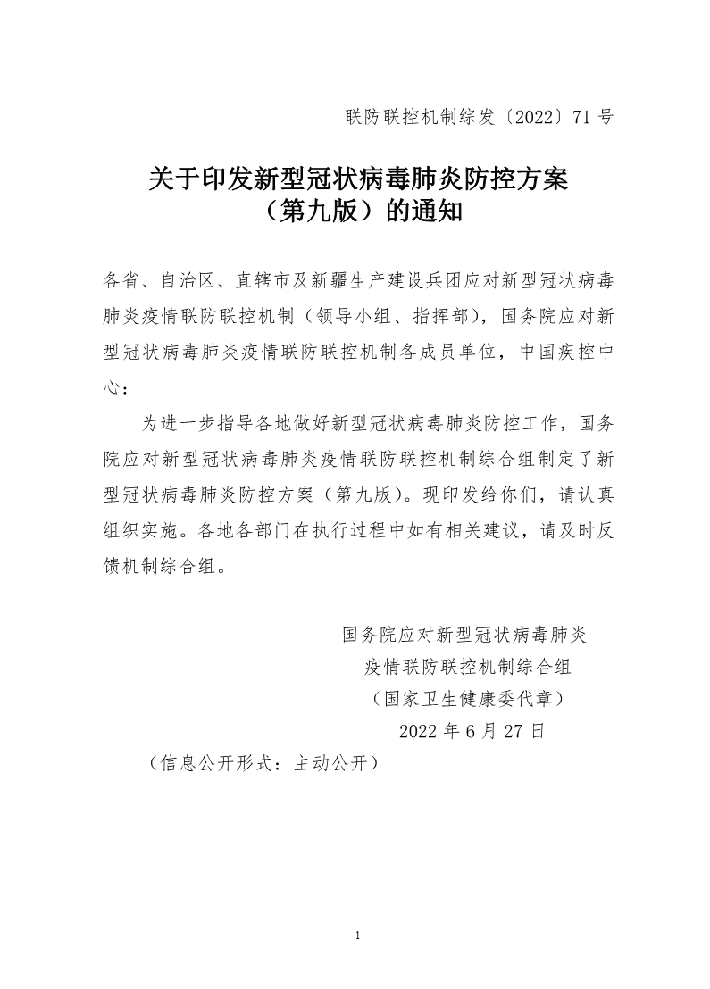 关于印发新型冠状病毒肺炎防控方案 (第九版)的通知