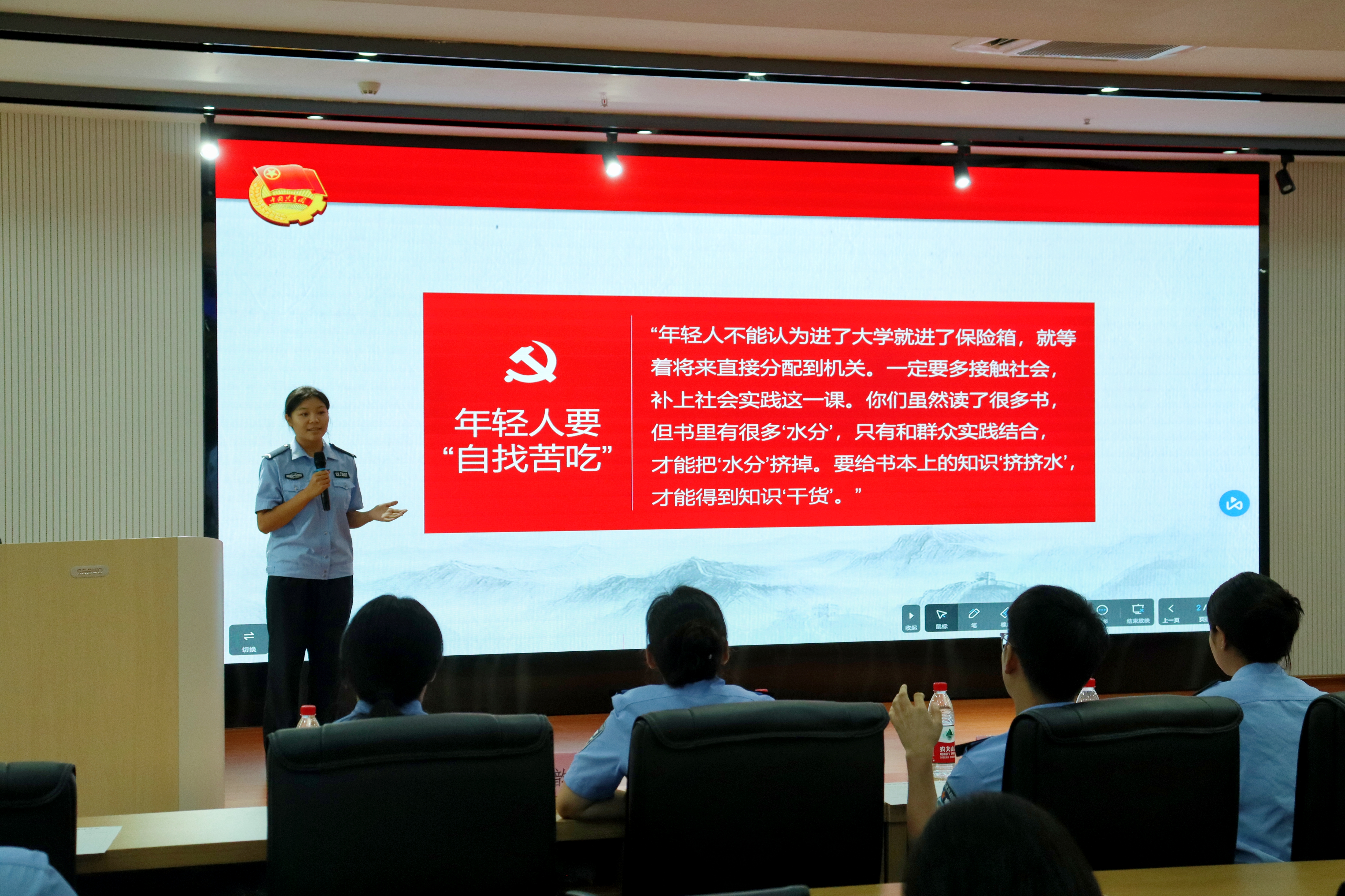 同学们还结合自己的生活实际,分享了如何将习近平总书记的教诲融入日常学习、工作和生活中。退役复学的舒雨同学,分享了自己在军营中的生活,叙述自找的“苦”如何淬炼青春的“甜”。文颖同学给我们分享了作为年轻人为什么要“自找苦吃”。他们纷纷表示,要牢记总书记的嘱托,勇于担当时代责任,为实现中华民族伟大复兴的中国梦贡献青春力量。