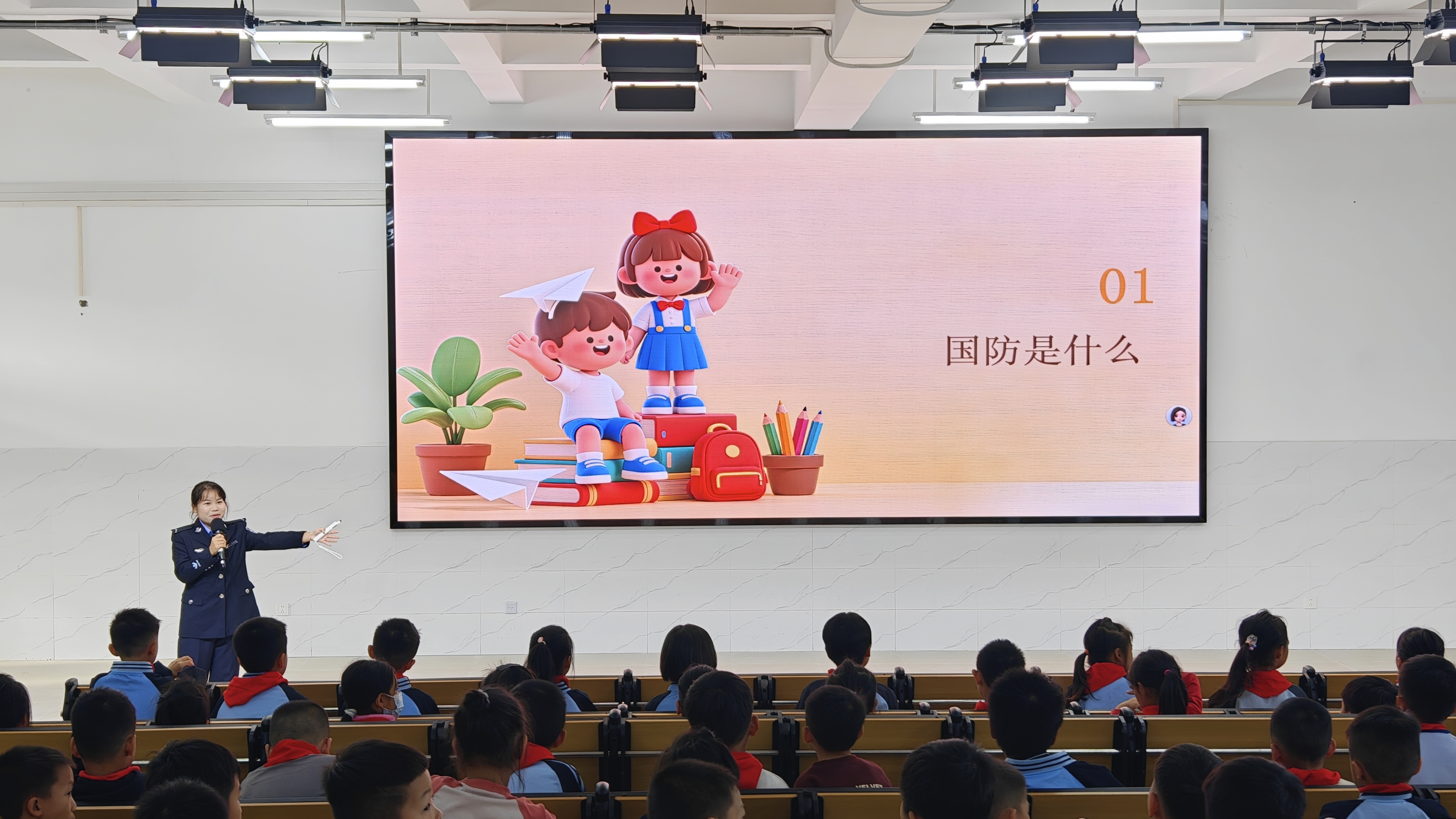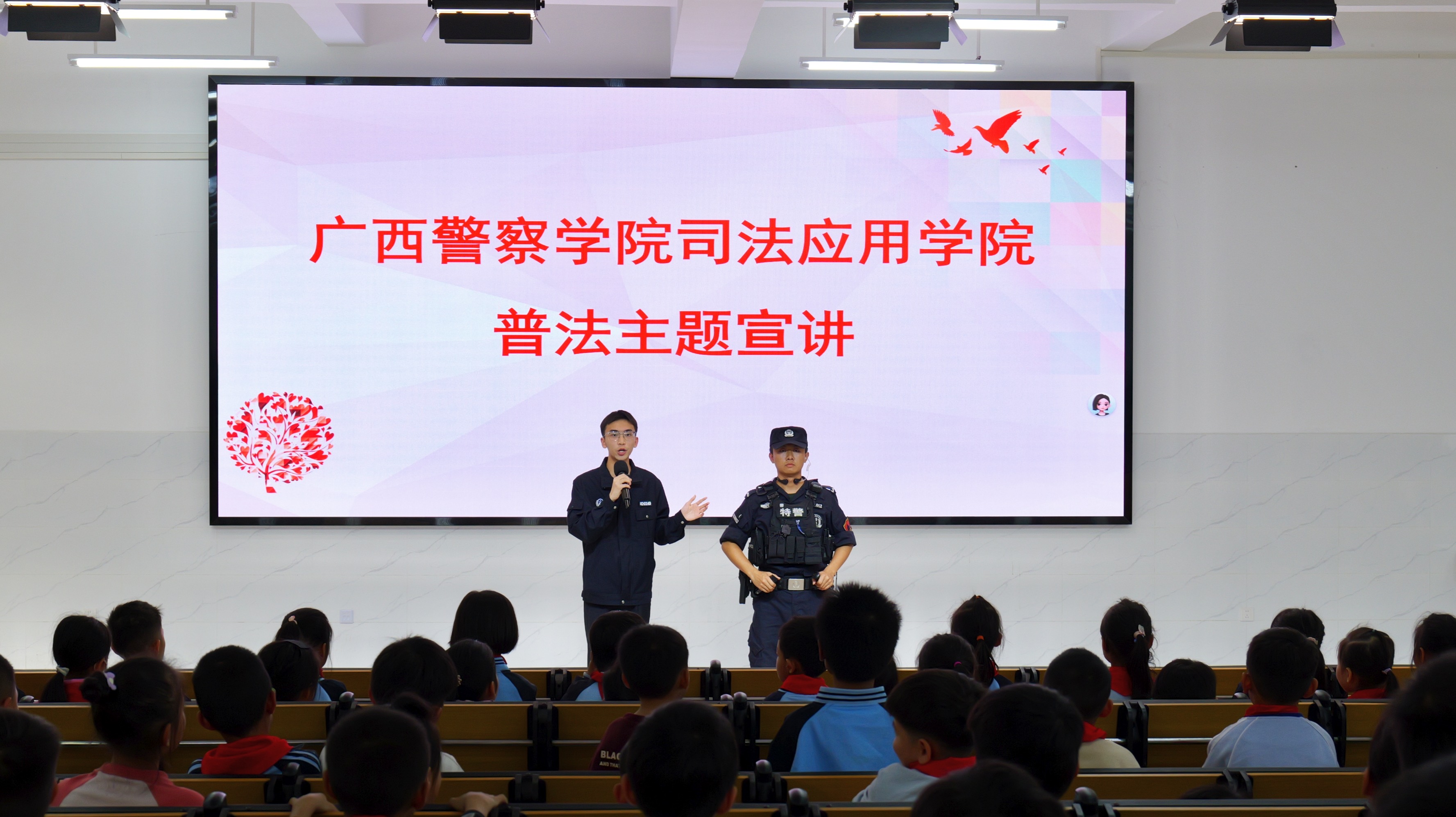 宣讲环节,司法应用学院社区矫正实践研讨社的同学给孩子们展示了警棍、手铐等装备,并讲解其安全功能与应用场景;司法明义讲师团成员围绕国防教育主题开展普法微课堂,结合案例与问答普及法律知识;警务战术协会通过实物展示与模拟演示,介绍警用装备在维护安全与服务群众中的作用,引导学生树立安全意识。现场交流积极,气氛活跃。