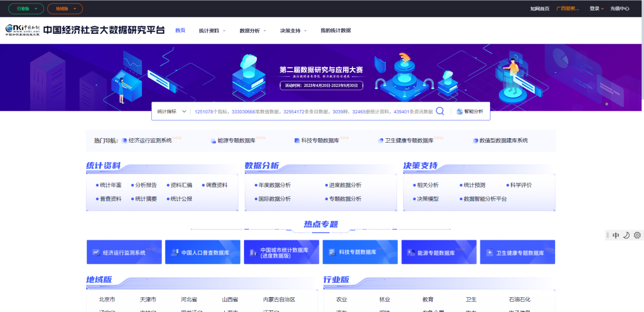 《中国经济社会大数据研究平台》是一个集统计数据资源整合、多维度统计指标快捷检索、数据深度挖掘分析及决策支持研究等功能于一体的汇集中国国民经济与社会发展统计数据的大型统计资料数据库。