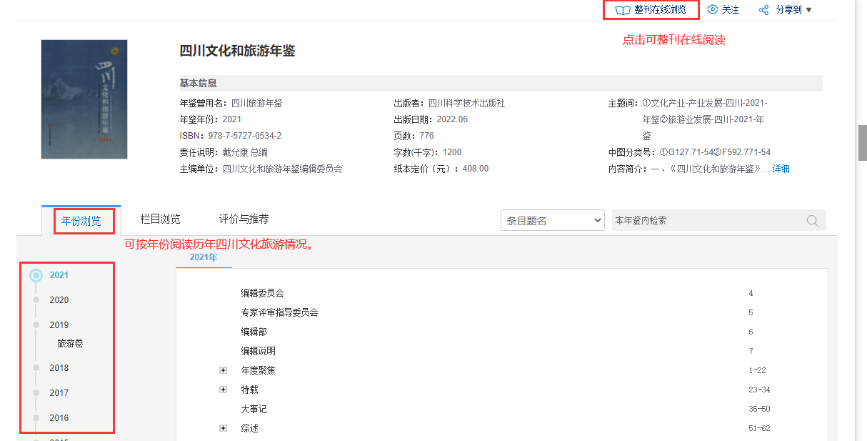 在年鉴首页左边点击进入年鉴导航,可按年鉴名、地域、关键词、主编、出版者等条件进行检索,进入具体年鉴页面后可整刊浏览;也可按年份、栏目进行浏览;还可以在该本年鉴内再次检索具体内容。