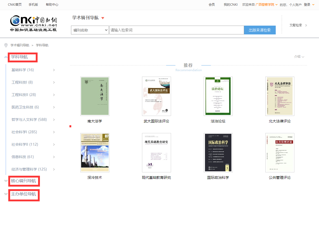 也可以点击“学术辑刊”,进入到辑刊首页。进入辑刊首页后与其他产品使用方式相同,点击左边的辑刊导航可以进一步查找目标辑刊详细信息,提供包括学科导航、核心辑刊导航、主办单位导航共3种导航方式。