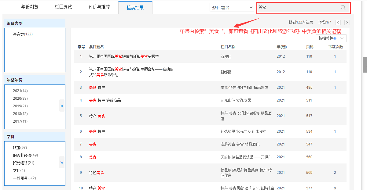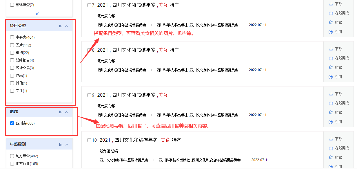 以“主题:美食;年鉴名称:成都年鉴;时间范围:2021-2023”为例,演示高级检索。