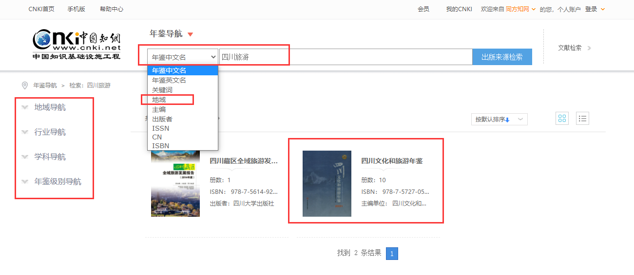 在知网首页,默认情况下“年鉴”是未勾选的。勾选“年鉴”后,在一框式中与其他文献一并进行统一检索得到结果;也可以点击“年鉴”,进入到年鉴首页。
