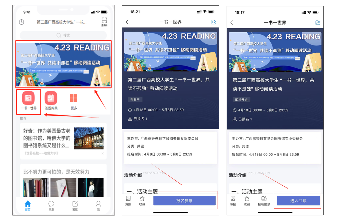 段点击首页轮播图或者“一书一世界”模块,右下角点击报名参与按照提示完成报名,返回首页点击右下角进入共读即可参与图书阅读;
