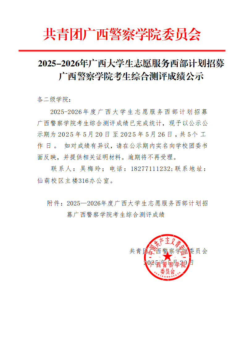 2025-2026年广西大学生志愿服务西部计划招募 beat365唯一官方网站考生综合测评成绩公示 来源: 发布时间:2025-05-20 13:40:37 浏览次数: 次 【字体:小 大】 附件:广西大学生志愿服务西部计划招募beat365唯一官方网站考生综合测评成绩.xlsx 分享到: 【打印正文】