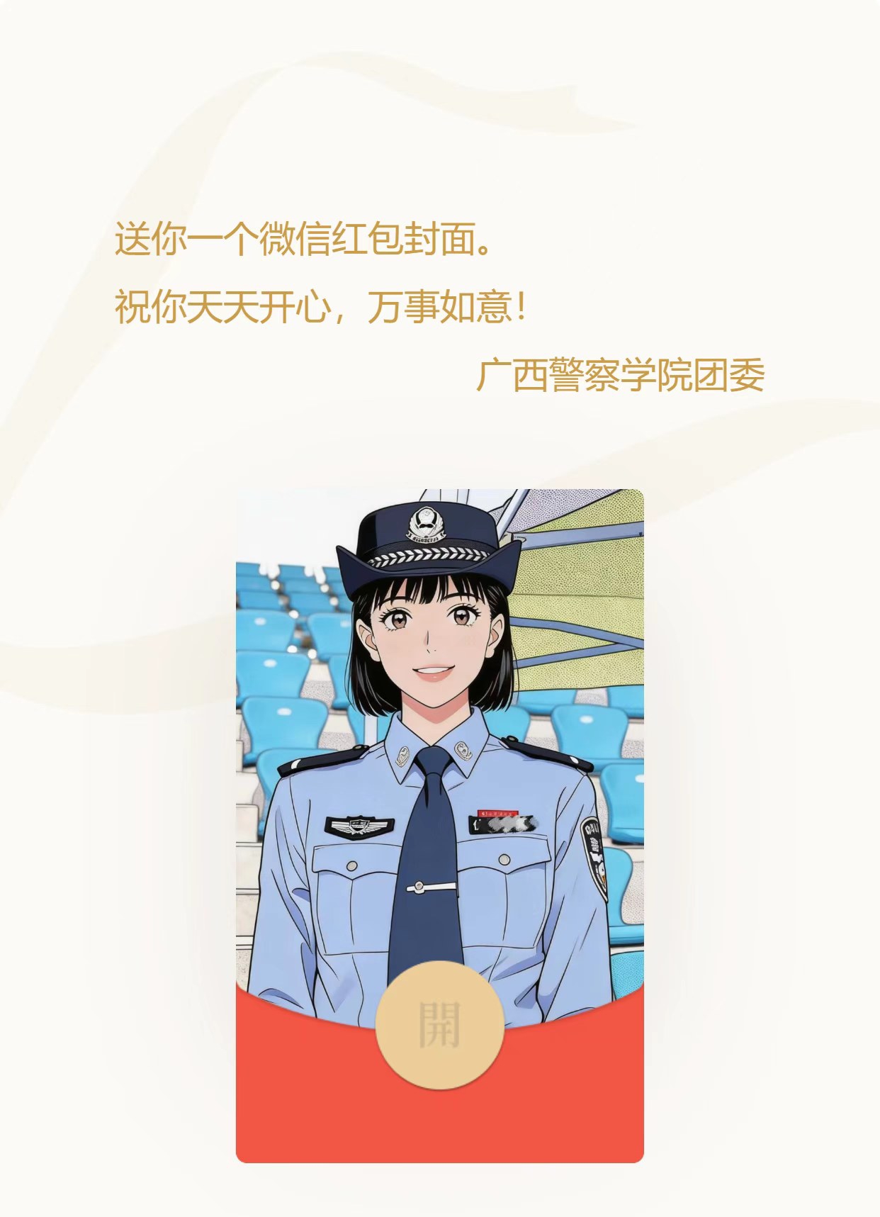 接好运!桂警院团团专属红包封面,马年福气“警”上添花! 来源: 发布时间:2026-02-14 11:00:37 浏览次数: 次 【字体:小 大】 马上要过年啦!祝大家新年新气象!红包封面也要用新的桂警院团团专属微信红包它来啦 预告:2月15日,另外两款红包封面将于18时推出。大家记好时间,切莫与红包封面擦肩而过! 分享到: 【打印正文】