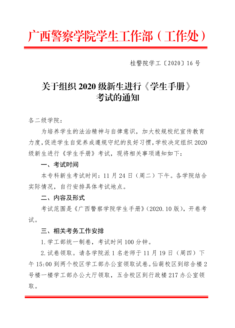 关于组织2020级新生进行《学生手册》考试的通知