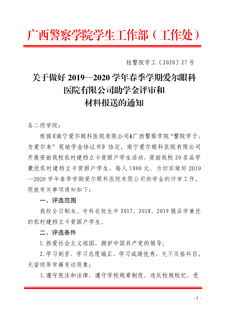 关于做好2019—2020学年度春季学期爱尔眼科助学金评审和材料报送的通知 来源: 发布时间:2020-12-30 10:35:28 浏览次数: 次 【字体:小 大】 附件1:南宁爱尔眼科医院有限公司助学金申请表.pdf附件2:爱尔眼科助学金学生汇总表.pdf 分享到: 【打印正文】