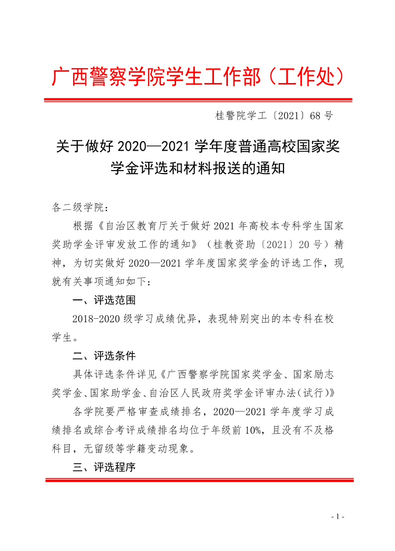 关于做好2020—2021学年度普通高校国家奖学金评选和材料报送的通知 来源: 发布时间:2021-09-10 15:00:06 浏览次数: 次 【字体:小 大】 附件1、2国家奖学金申请审批表及填写说明.pdf附件4:2021年奖学金、助学金民主评议记录表.pdf 分享到: 【打印正文】