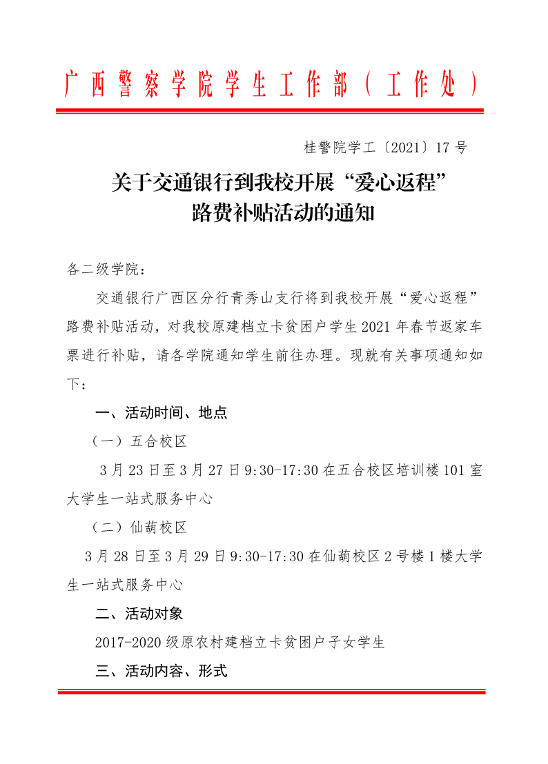 关于交通银行到校开展“爱心返程”路费补贴活动的通知
