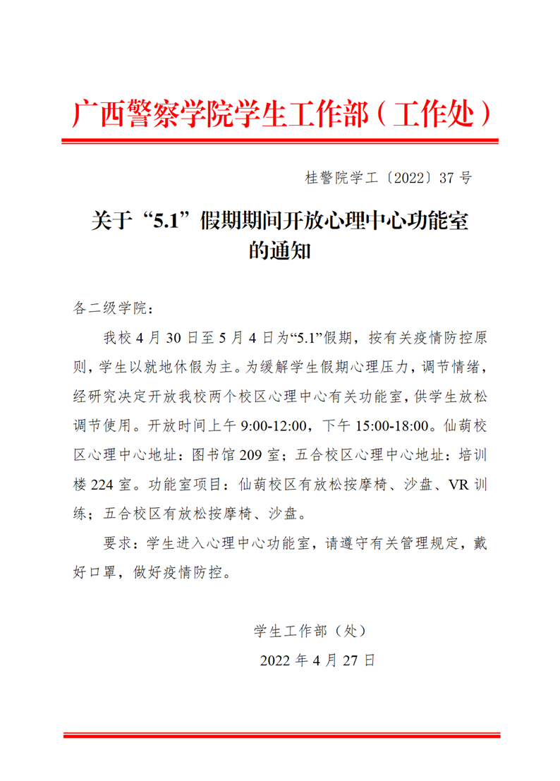 关于“5.1”假期期间开放心理中心功能室的通知