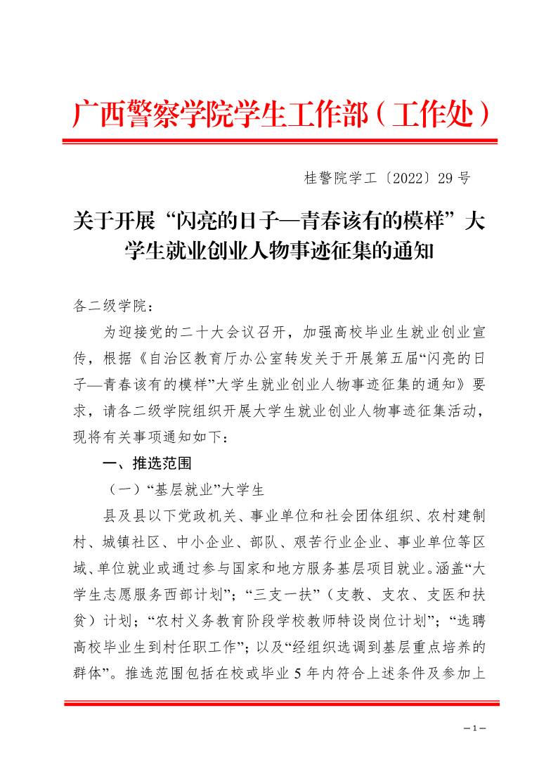 关于开展“闪亮的日子——青春该有的模样”大学生就业创业人物事迹征集的通知 来源: 发布时间:2022-04-14 11:00:31 浏览次数: 次 【字体:小 大】 附件1:第五届“闪亮的日子——青春该有的模样”人物推荐表.pdf附件2:“闪亮的日子——青春该有的模样”推荐汇总表.pdf附件3:关于开展第五届 “闪亮的日子——青春该有的模样”大学生就业创业人物事迹征集的通知.pdf 分享到: 【打印正文】