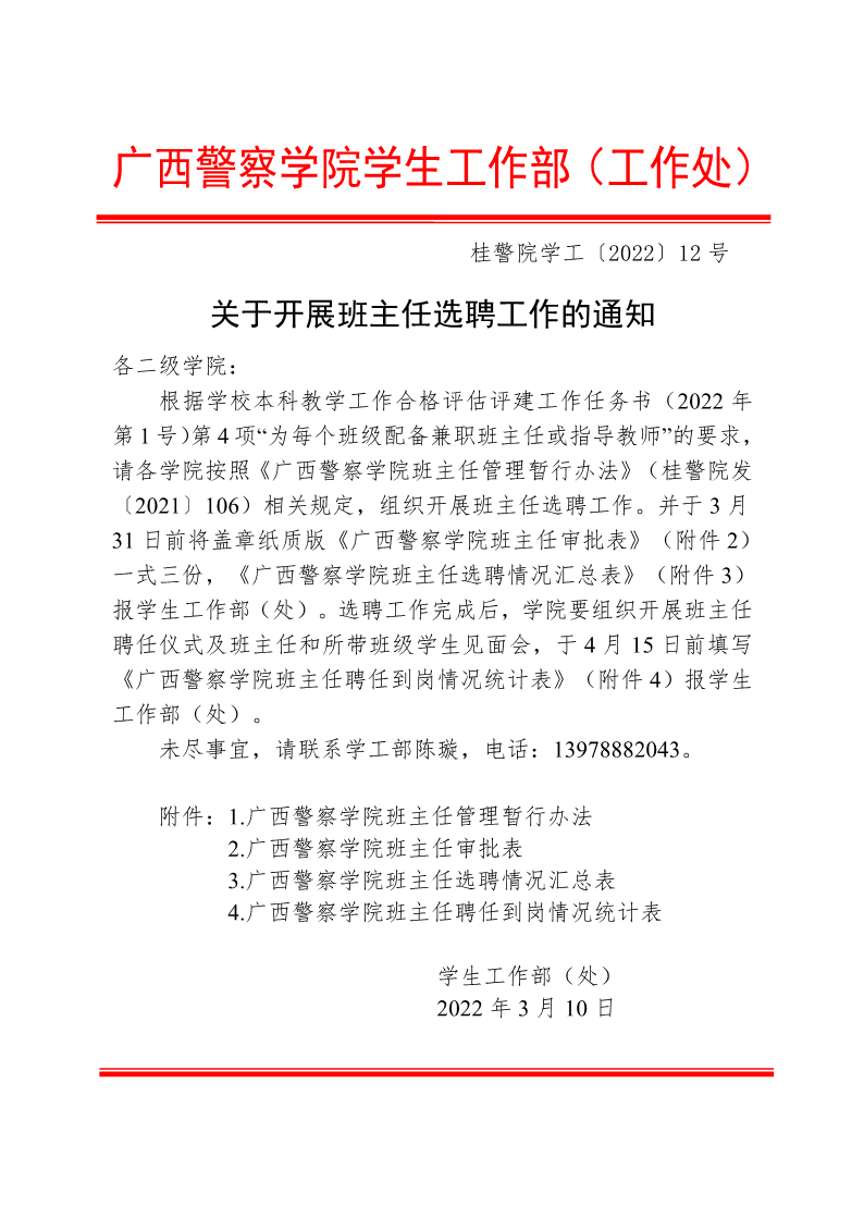 关于开展班主任选聘工作的通知 来源: 发布时间:2022-03-10 11:00:46 浏览次数: 次 【字体:小 大】 附件1: beat365唯一官方网站关于印发班主任管理暂行办法的通知.pdf附件2:beat365唯一官方网站班主任审批表.pdf附件3:beat365唯一官方网站班主任选聘情况汇总表.pdf附件4: beat365唯一官方网站班主任聘任到岗情况统计表.pdf 分享到: 【打印正文】