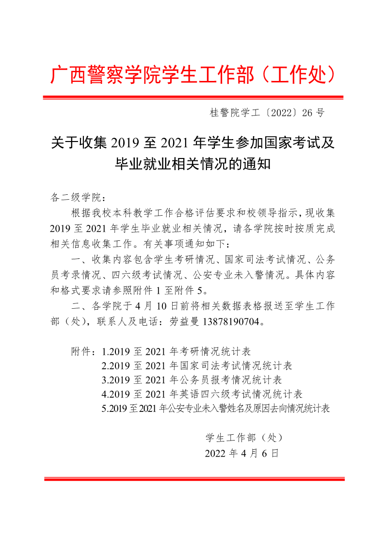 关于收集2019至2021年学生参加国家考试及毕业就业相关情况的通知 来源: 发布时间:2022-04-06 10:00:10 浏览次数: 次 【字体:小 大】 附件1:2019至2021年考研情况统计表.pdf附件2:2019至2021年司法考试情况统计表.pdf附件3:2019至2021年公务员报考情况统计表.pdf附件4:2019至2021年英语四六级考试情况统计表.pdf附件5:2019至2021年公安专业未入警情况统计表.pdf 分享到: 【打印正文】