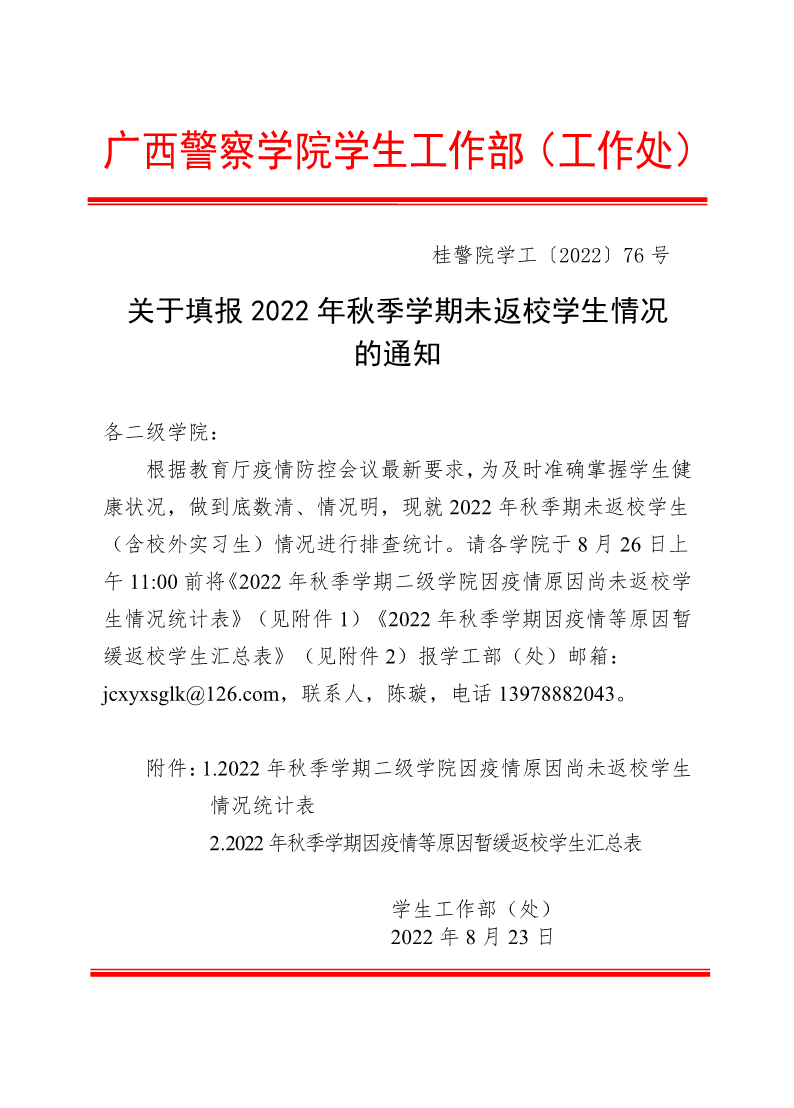 关于填报2022年秋季学期未返校学生情况的通知 来源: 发布时间:2022-08-23 11:00:30 浏览次数: 次 【字体:小 大】 附件1: 2022年秋季学期二级学院因疫情原因尚未返校学生情况统计表.pdf附件2: 2022年秋季学期因疫情等原因暂缓返校学生汇总表.pdf 分享到: 【打印正文】