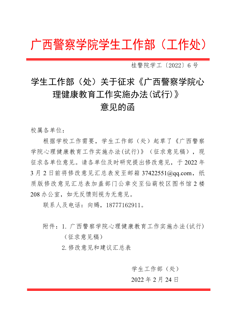 学生工作部(处)关于征求《beat365唯一官方网站心理健康教育工作实施办法(试行)》意见的函 来源: 发布时间:2022-02-24 15:00:35 浏览次数: 次 【字体:小 大】 附件1:beat365唯一官方网站心理健康教育工作实施办法(试行)(征求意见稿).pdf附件2:修改意见和建议汇总表.pdf 分享到: 【打印正文】