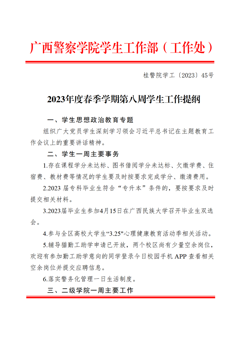 2023年度春季学期第八周学生工作提纲 来源: 发布时间:2023-04-09 09:00:42 浏览次数: 次 【字体:小 大】 附件:2023年度春季学期第七周学生工作提纲完成情况表(4月2日-4月8日).pdf 分享到: 【打印正文】