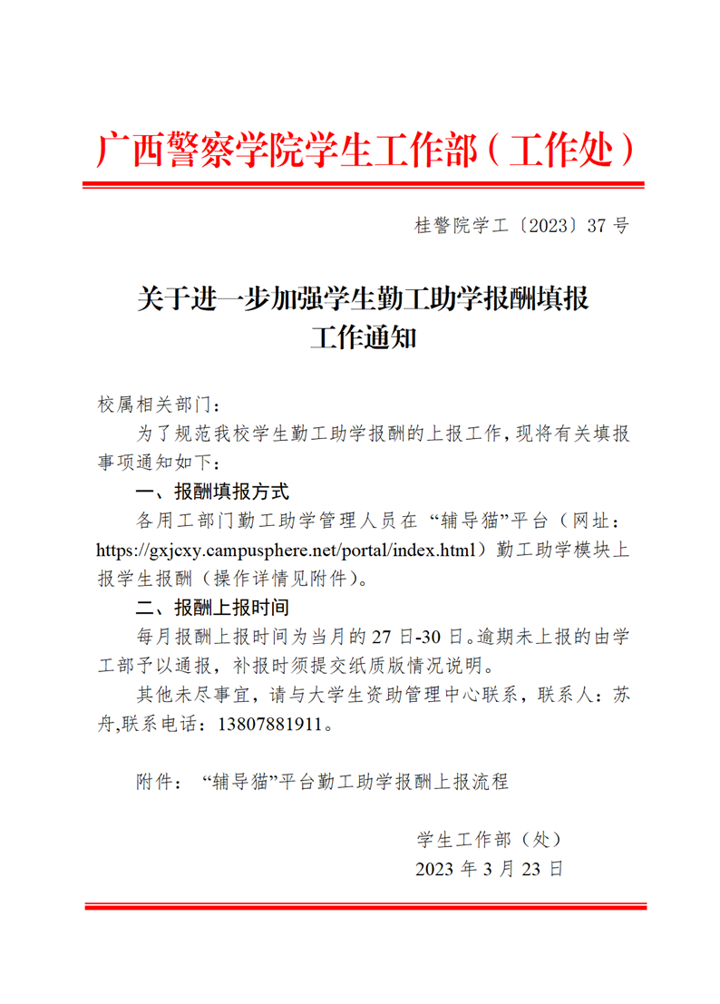 关于进一步加强学生勤工助学报酬填报工作的通知 来源: 发布时间:2023-03-23 09:00:51 浏览次数: 次 【字体:小 大】 附件 :“辅导猫”平台勤工助学报酬上报流程.pdf 分享到: 【打印正文】