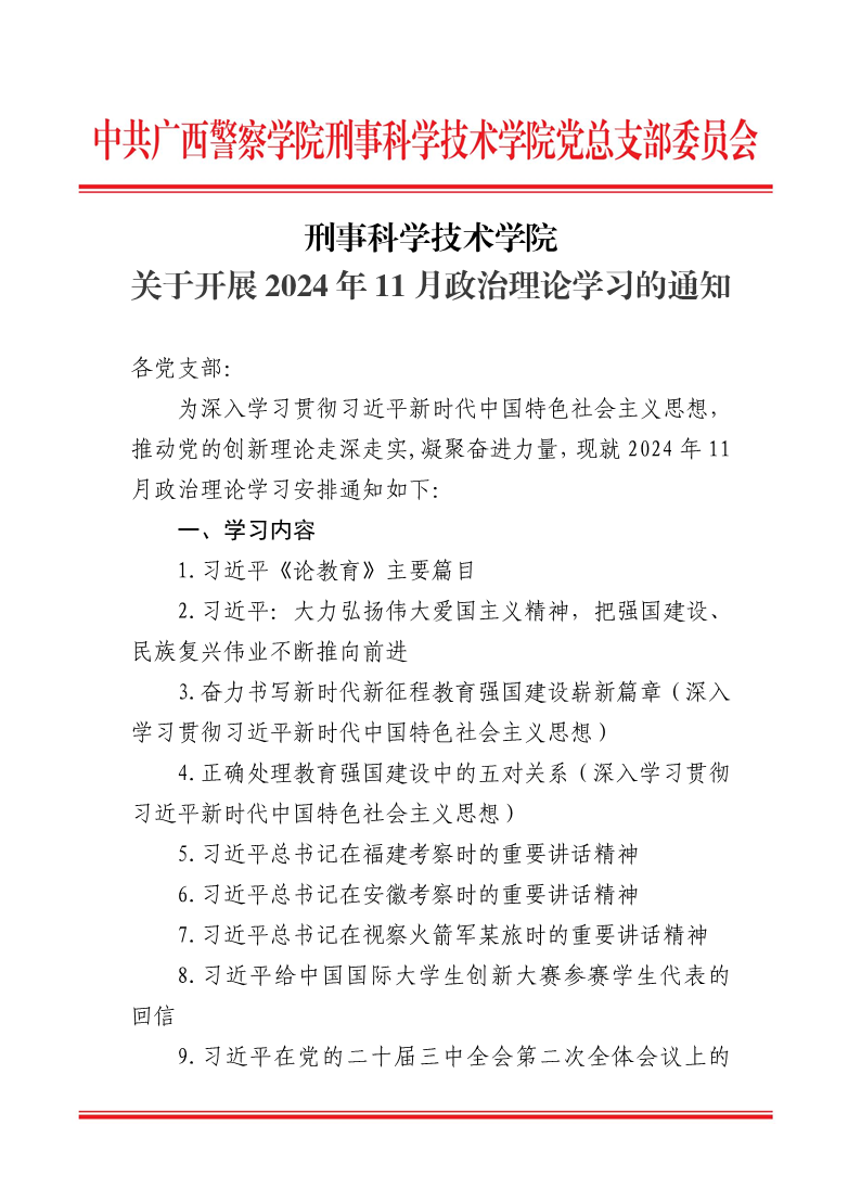 刑事科学技术学院 关于开展2024年11月政治理论学习的通知