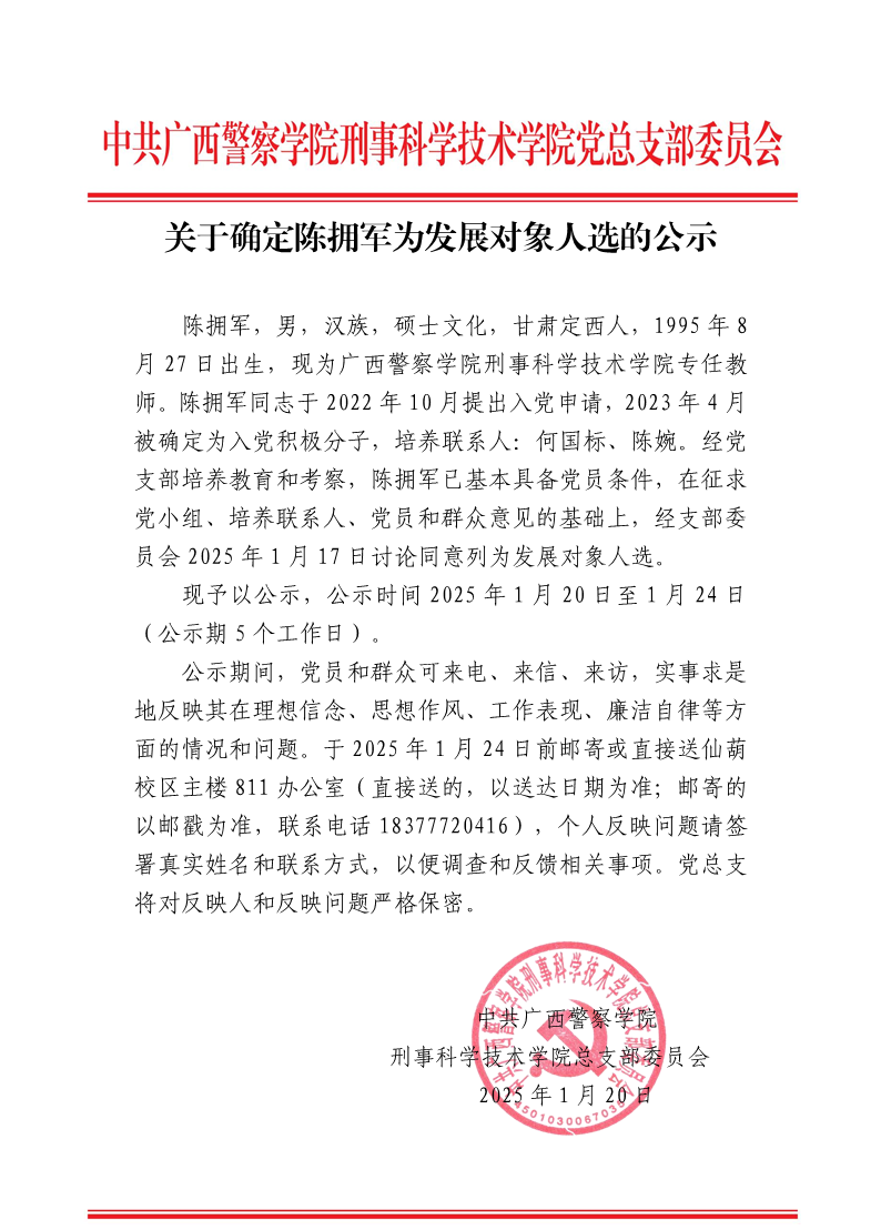 关于确定陈拥军为发展对象人选的公示