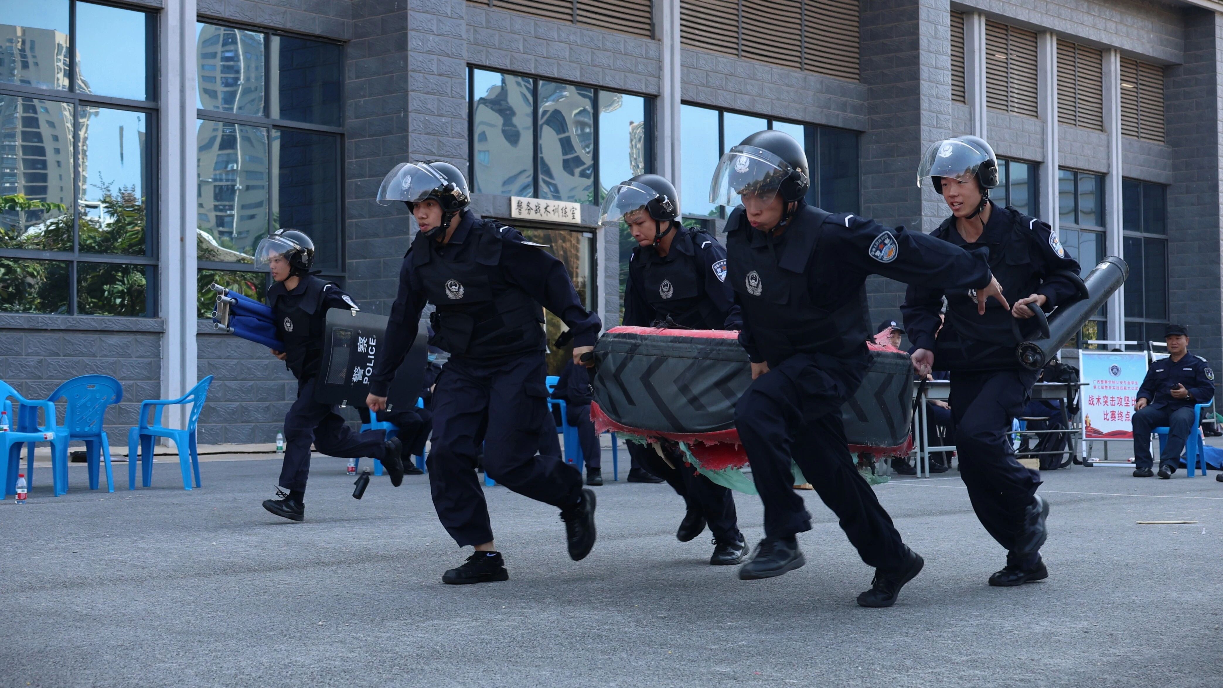 本次大比武的竞赛项目共分战术攻坚、实战应用射击、警械实战运用、野外警情处置、警务实战常用法律知识竞赛五大项目,分别从不同维度检验公安专业学生的综合素养。