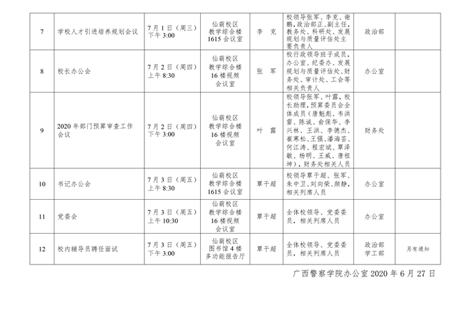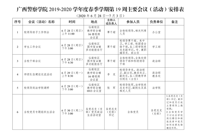 学校第19周主要会议(活动)安排(2020.6.28.-7.3.)