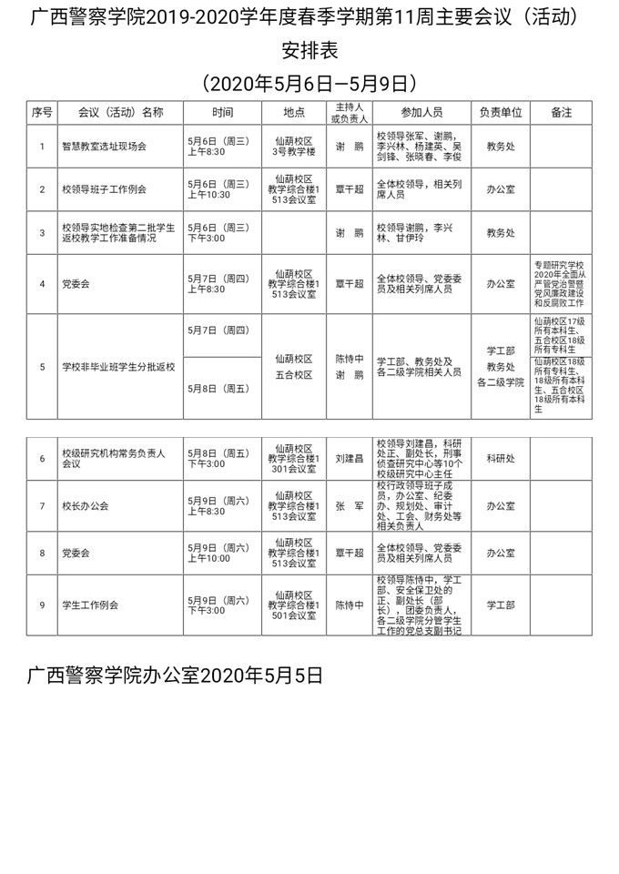 学校第11周主要会议(活动)安排(2020.5.6.-5.9.)