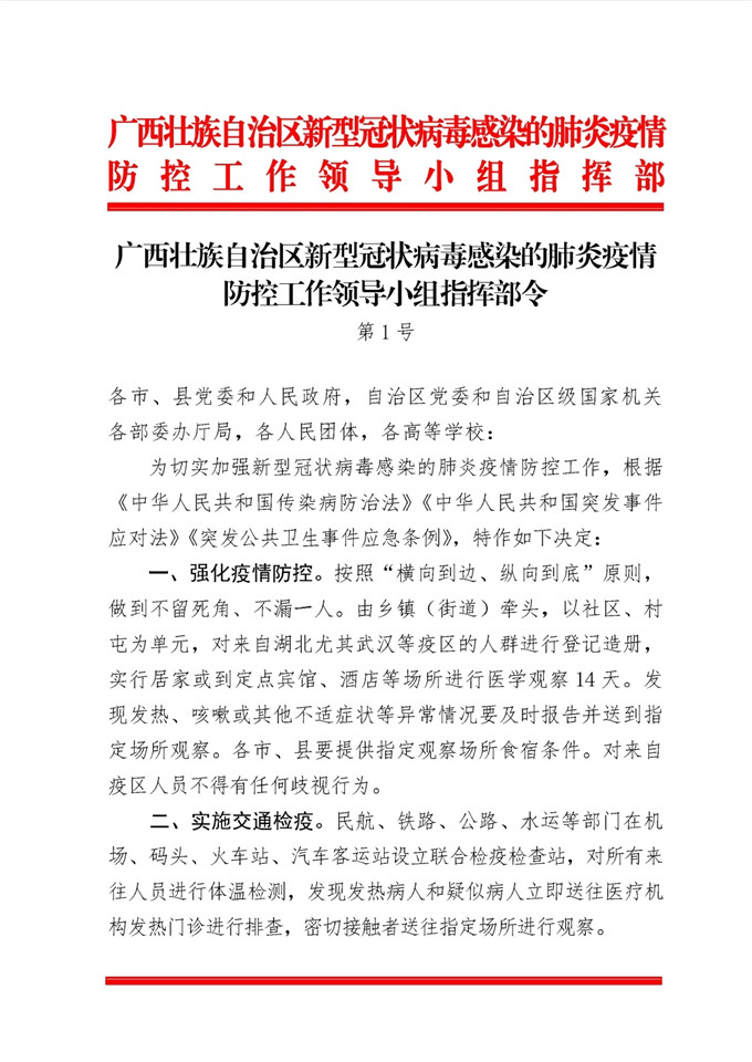 【上级文件】广西壮族自治区新型冠状病毒感染的肺炎疫情防控工作领导小组指挥部令第1号