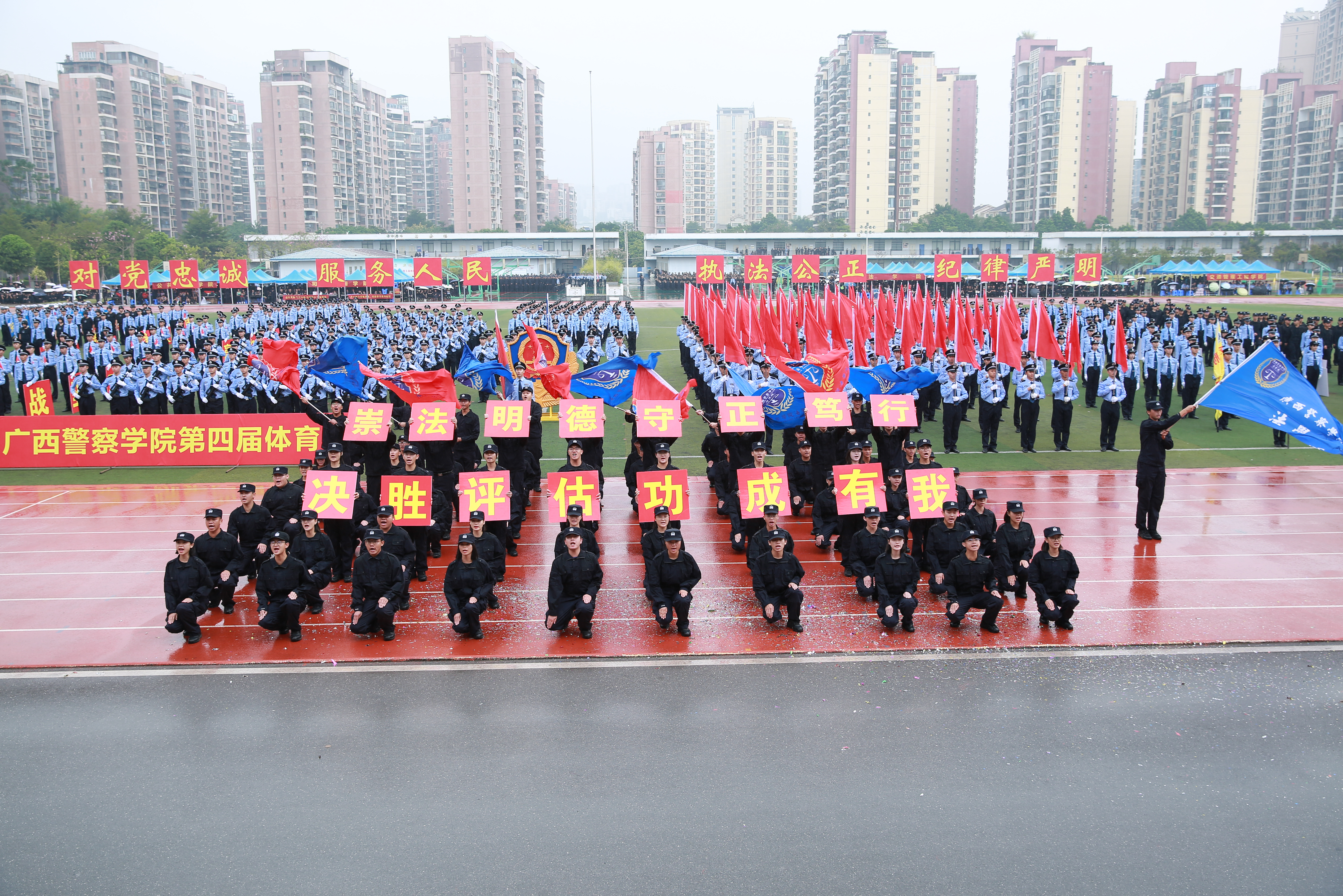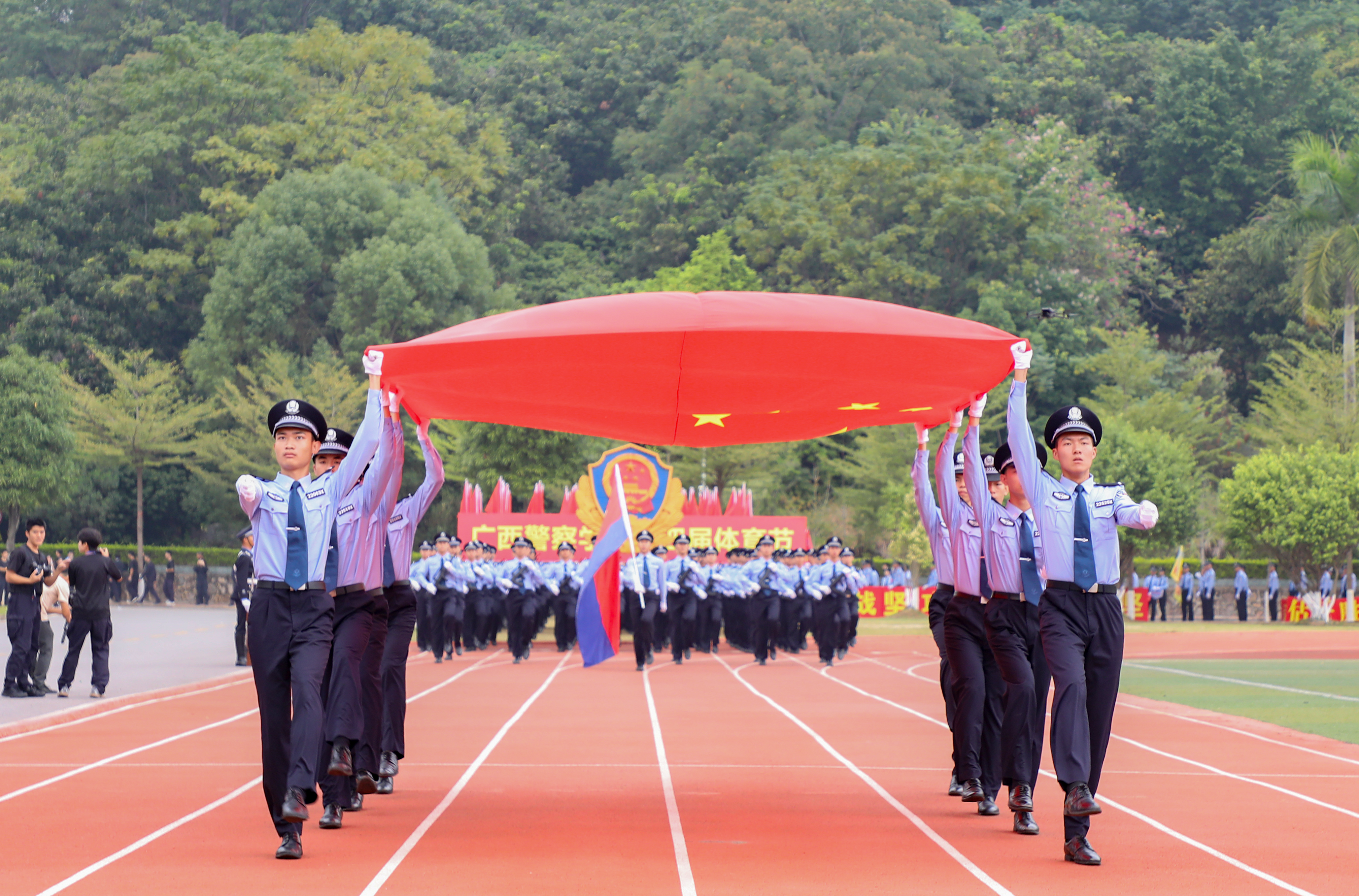 上午9时许,在激昂的乐曲声中,国旗护卫队、警旗警徽方队英姿飒爽、步履铿锵,护送庄严的五星红旗、警旗及警徽,昂首阔步朝主席台走来。紧随其后的是运动会标识护卫队、红旗方队、教官团分列方队、裁判员代表和各学院特色展示方阵。冒着秋雨,各方阵怀着饱满的热情、昂扬的斗志,喊出的口号响彻体育场上空,尽显警院学子的坚毅与不畏困难的良好精神风貌。