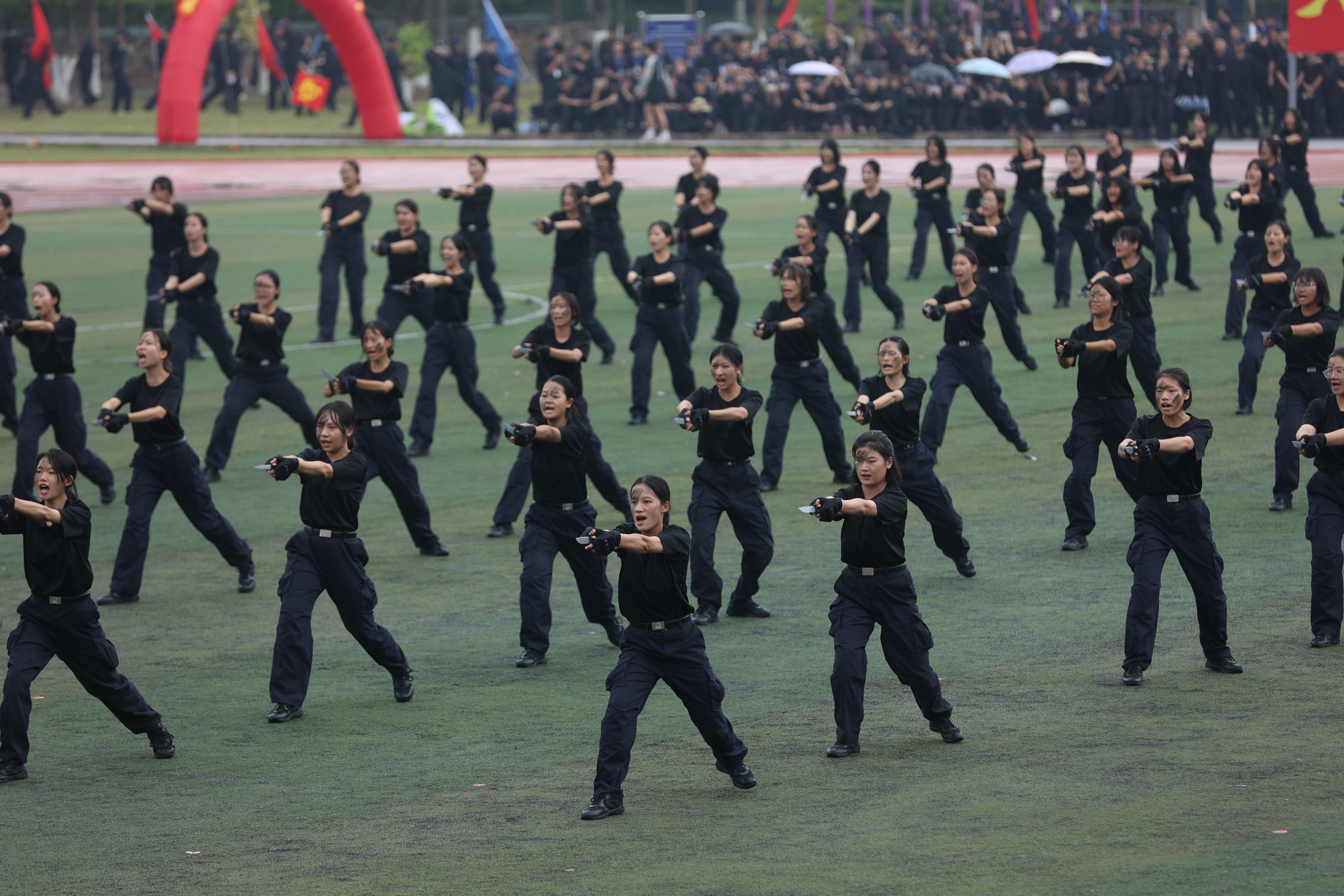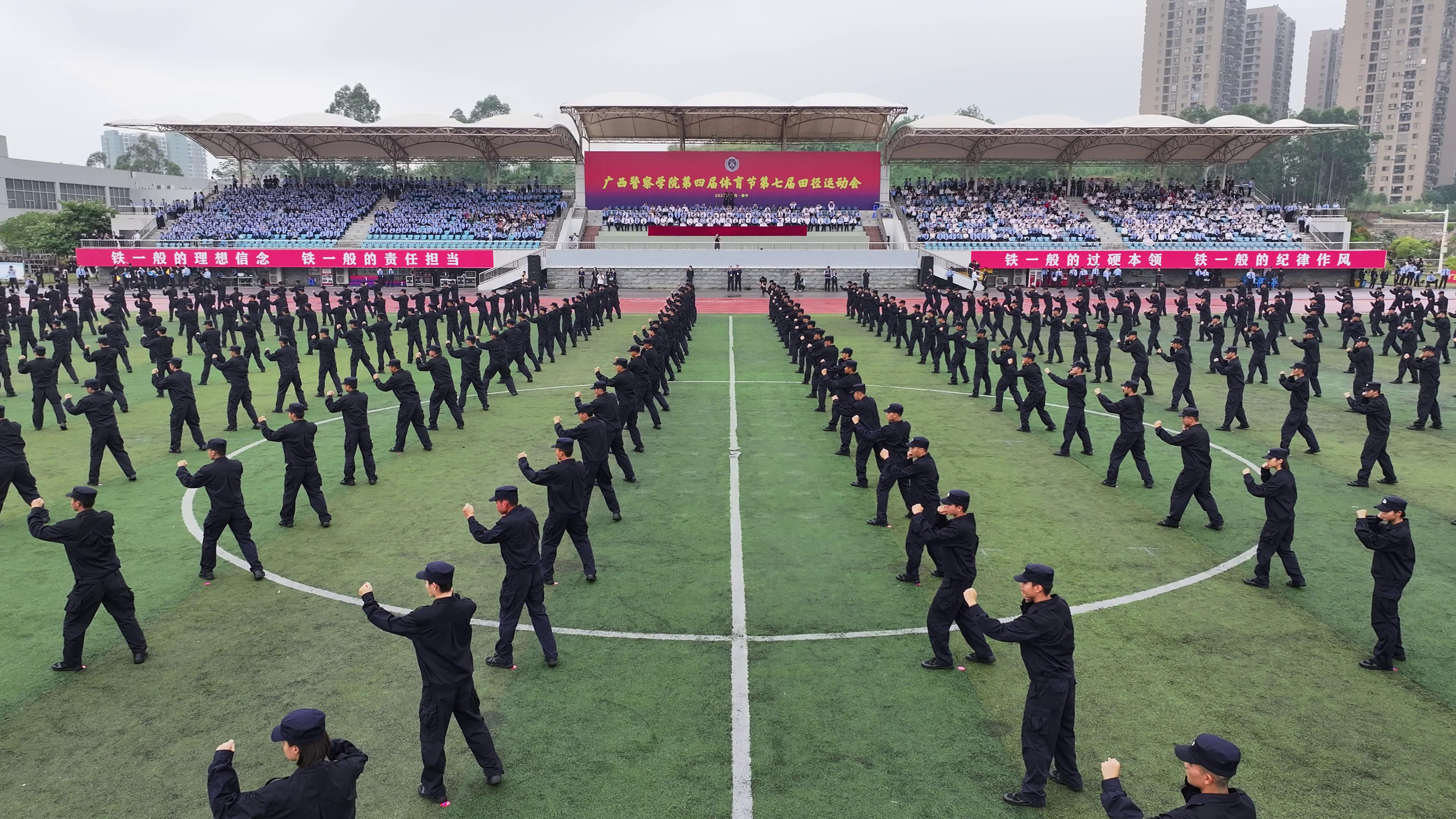 随后,在警务技能展示环节,358名2023级女同学组成的特战匕首术方阵,表演了极具视觉冲击的匕首术,800名2023级公安专业新生组成的擒敌拳方块,进行了精彩的擒敌拳展示,充满力量与朝气的表演赢得阵阵掌声。