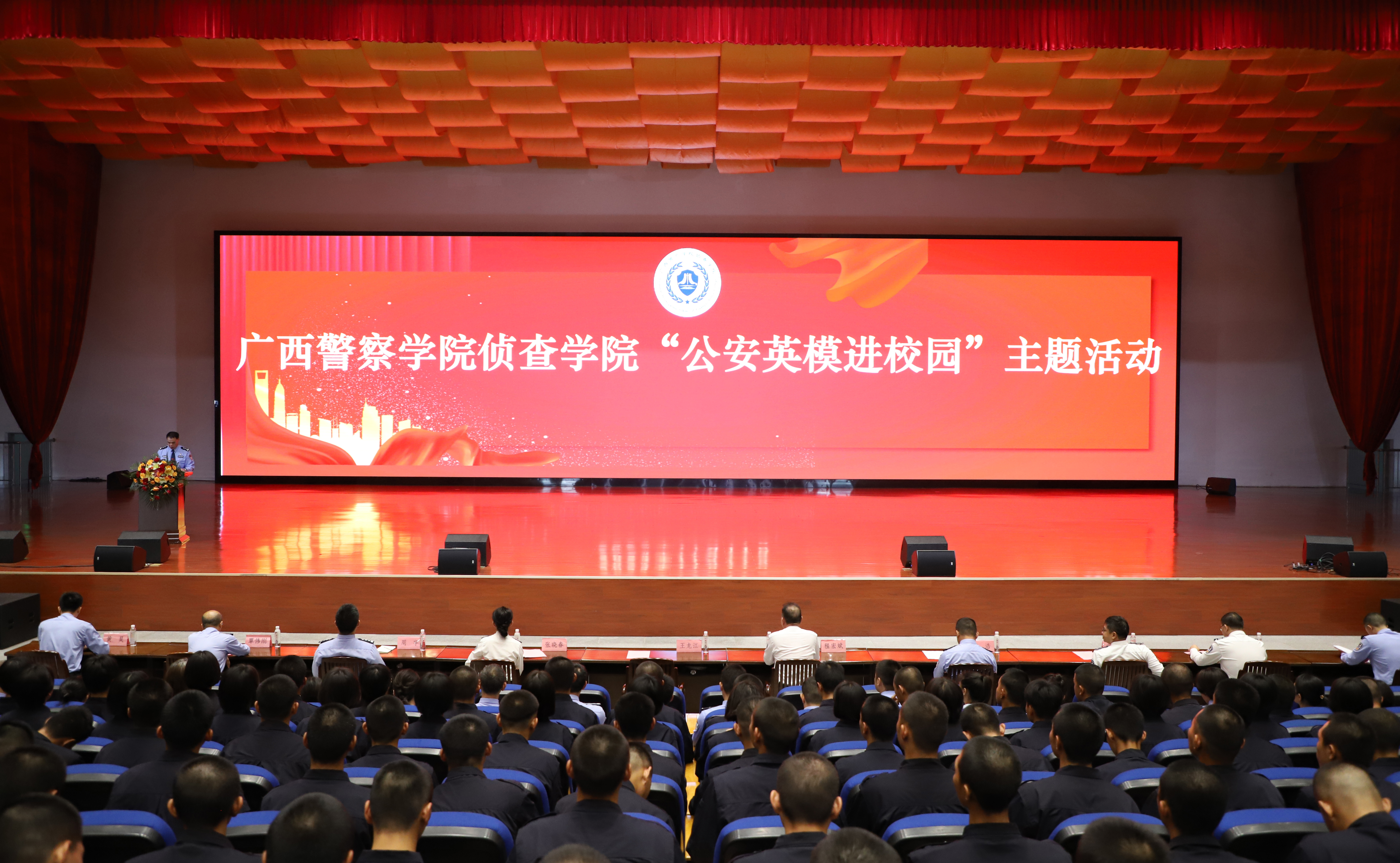 为深入学习贯彻习近平总书记给中国人民公安大学在读英烈子女重要回信精神,大力弘扬公安英模精神,充分发挥先进典型示范引领作用,激励广大师生向公安英雄模范学习看齐。近日,学校在仙葫校区学术报告中心举办“公安英模进校园”专题报告会,邀请全国优秀共产党员、全国公安机关二级英雄模范、全国扫黑先进个人、全国公安“百佳刑警”、柳州市公安局刑侦支队副支队长王龙江,全国优秀人民警察、南宁市公安局特警支队副支队长曾浩,“邕城平安卫士”、南宁市公安局禁毒支队副支队长周宇为beat365官网师生作专题报告。报告会由学校侦查学院承办,侦查学院党总支书记程宏斌主持报告会。