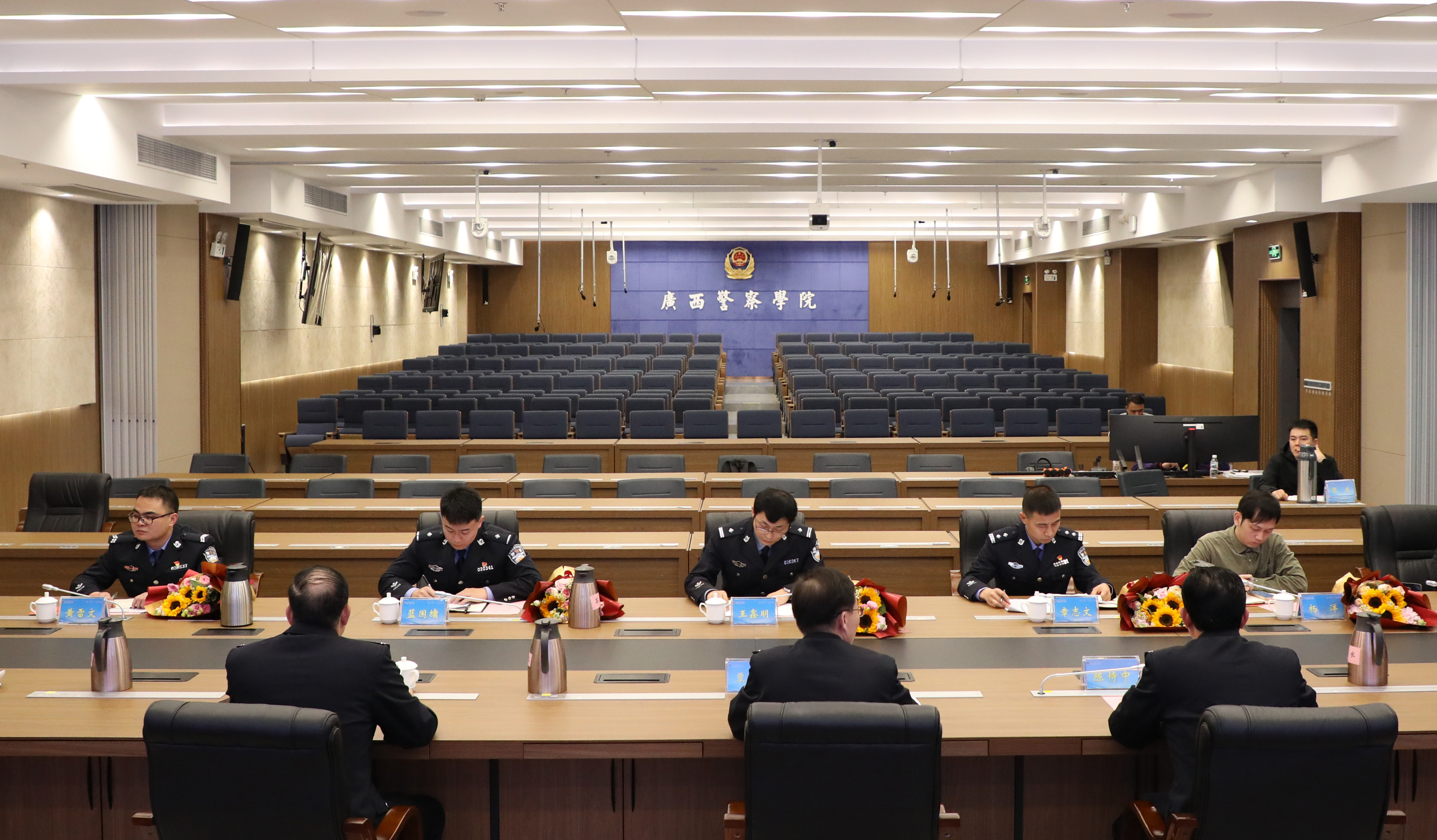 2月3日,学校在仙葫校区公安研训基地召开驻村干部慰问座谈会,校领导覃干超、李克、陈恃中、谢鹏、叶露出席会议,驻村干部王鑫明、章志文、蓝国墉、黄雷文、杨洋,学校驻村干部派出单位党组织负责人参加会议。参会的驻村第一书记、工作队员分别汇报了驻村一年来抓班子、强党建、促致富、惠民生等方面的工作情况。学校党委书记覃干超对第一书记、工作队员们全身心投入乡村振兴工作并取得良好成绩给予了充分肯定,并代表学校党委向全体工作在乡村振兴工作一线的同志们表示诚挚的祝福和美好的祝愿。覃干超要求学校驻村第一书记和工作队员们提高政治站位、强化责任意识、严格遵守纪律,深入学习贯彻习近平总书记关于“三农”工作的重要论述和对广西重大方略要求,认真落实中央和自治区关于乡村振兴工作各项决策部署,充分发扬人民警察特别能吃苦特别能战斗的优良作风,以实际行动展现警院帮扶干部良好的精神风貌,扎实推进乡村振兴各项工作,推动群众持续受益、村庄更好发展,驻村工作结出更加丰硕的果实。
