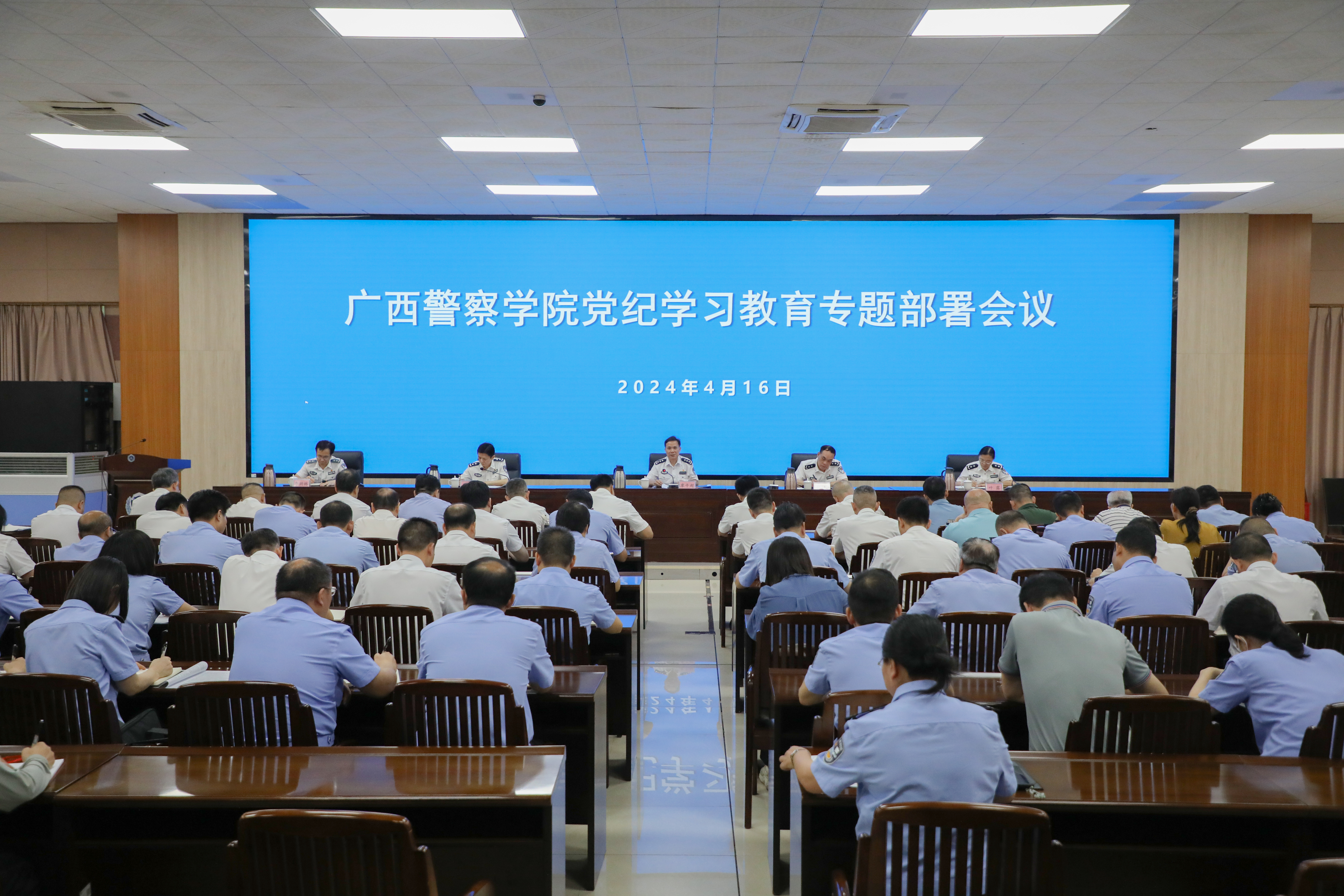 黎东主持时强调,全校各级党组织要认真学习传达贯彻会议精神,把思想和行动统一到党中央、自治区党委的决策部署上来,统一到学校党委的工作要求上来。各级领导干部要率先垂范,带头学纪、知纪、明纪、守纪,进一步提高党性修养,强化纪律意识、提高“政治三力”,始终做到忠诚干净担当,确保党纪学习教育取得实实在在的成效,深入推进清廉警院建设,为广西公安教育事业高质量发展提供坚强纪律保障。