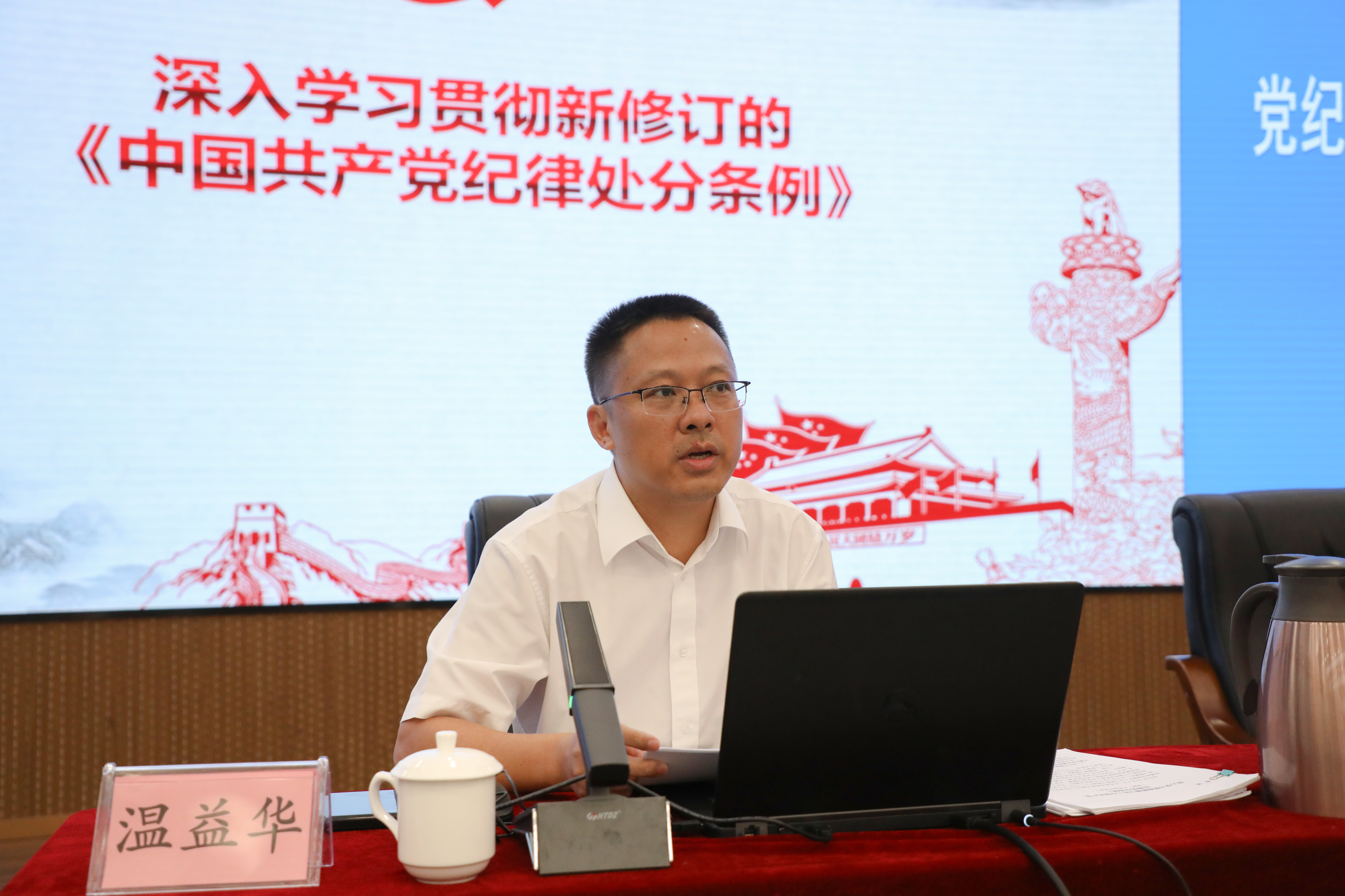 自治区纪委监委第一监督检查室主任、一级调研员、三级高级监察官温益华作党纪学习教育专题辅导报告,围绕新修订的《中国共产党纪律处分条例》,从“为什么要修订条例”“条例的主要内容是什么”“严守规矩、不逾底线,做遵规守纪的表率”三个方面结合实际和工作体会,为与会人员进行了详实生动、深入浅出的讲授。