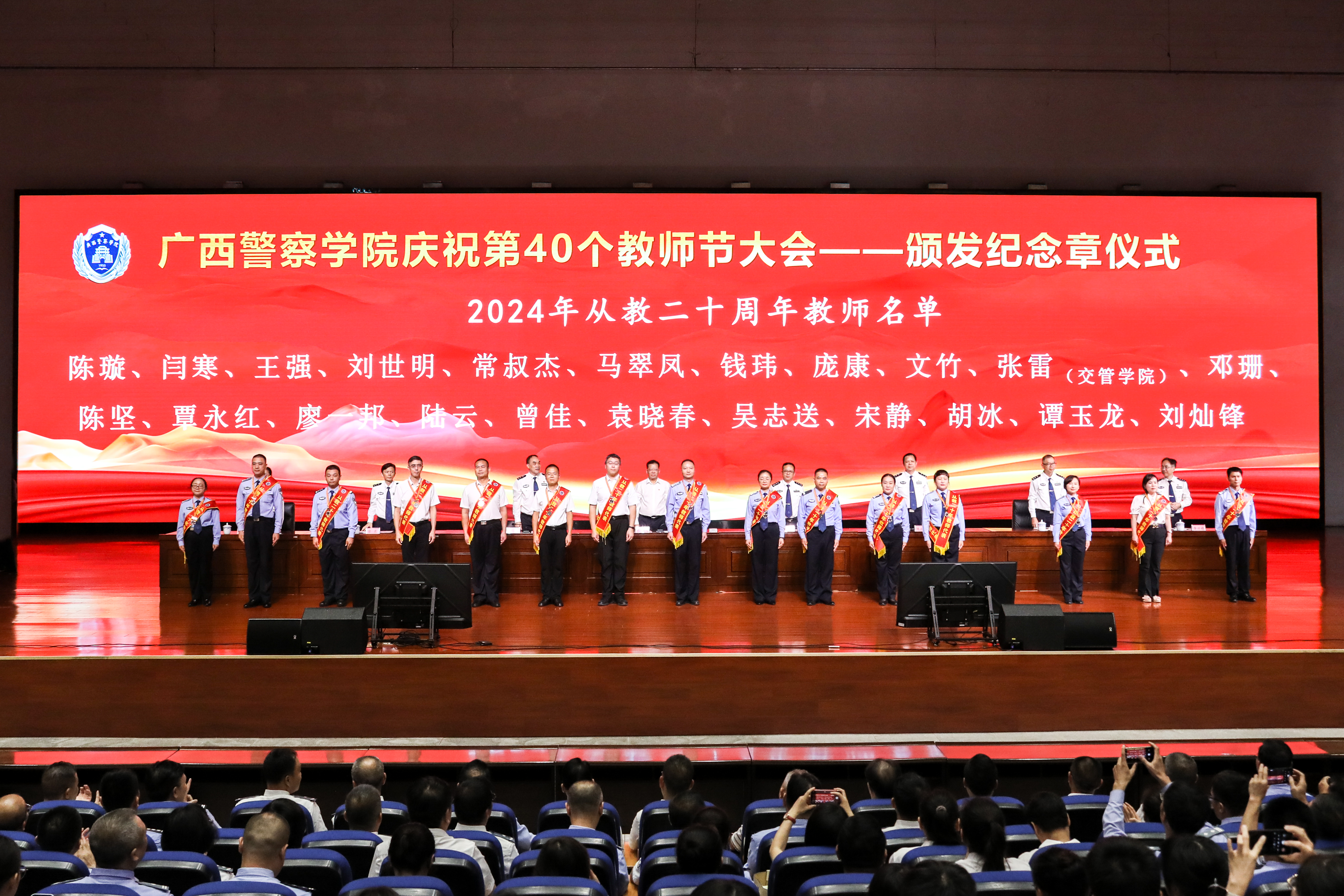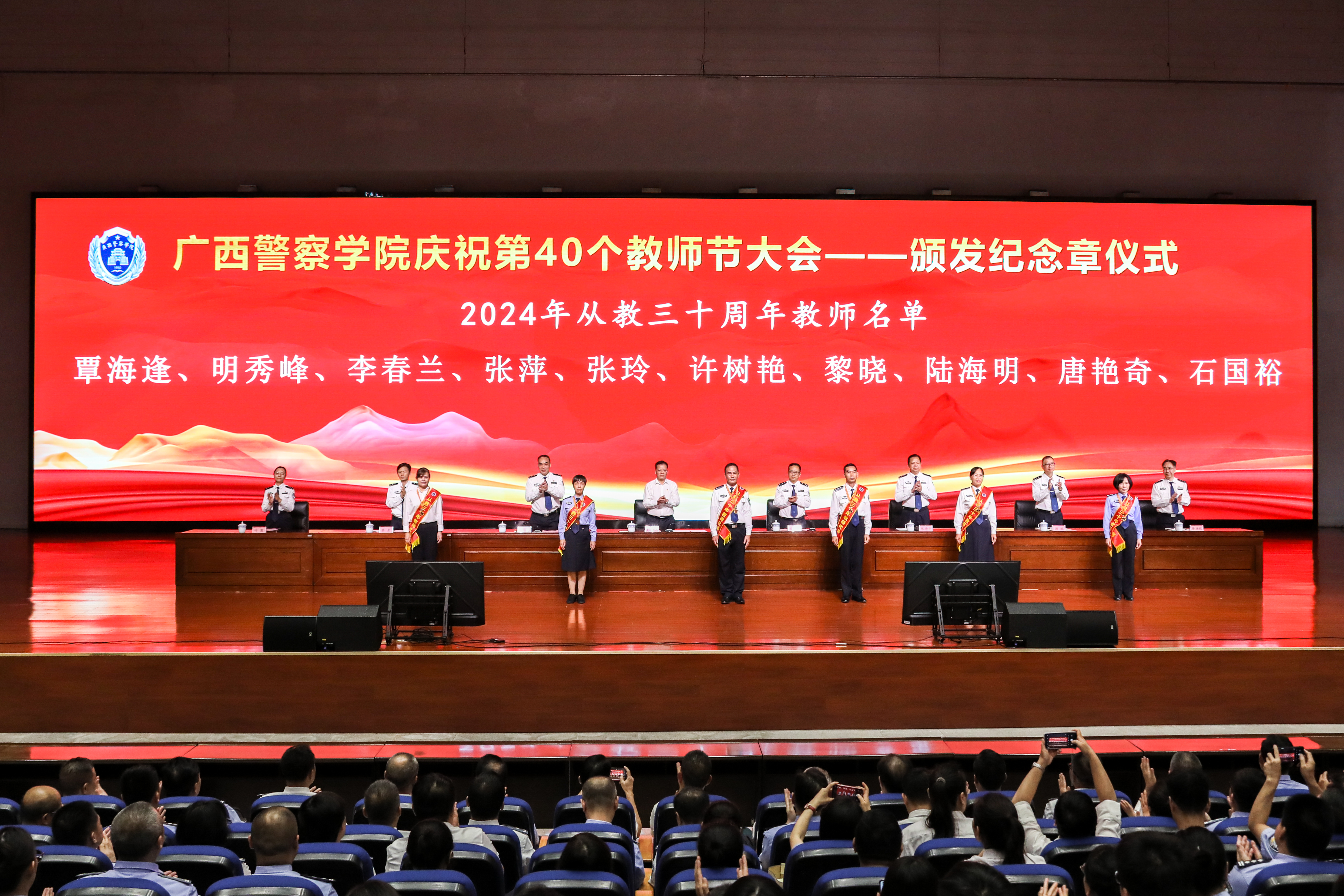 校领导为2024年从教二十、三十周年的教师代表颁发纪念章,向为党的教育事业辛勤工作的教师表示敬意。